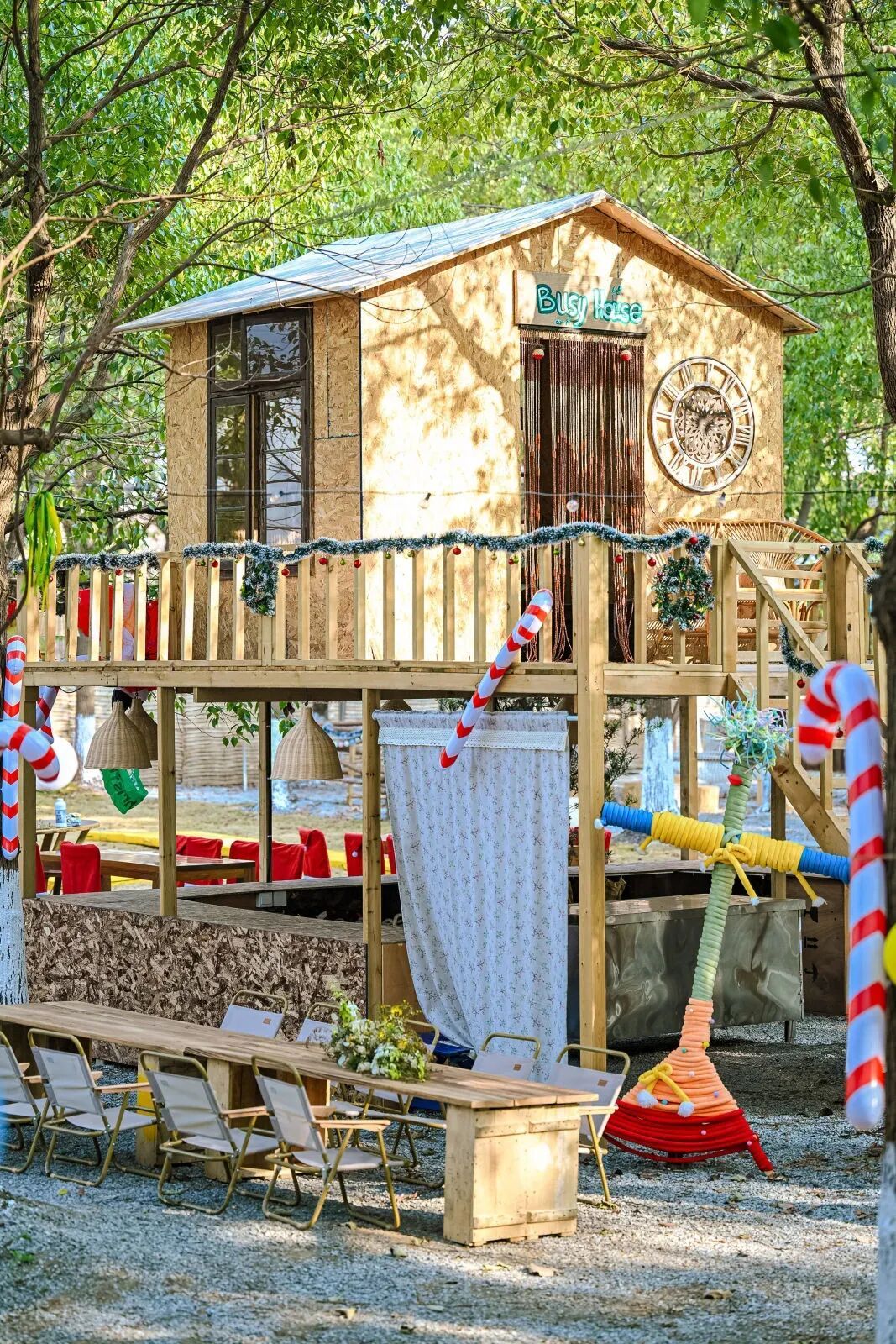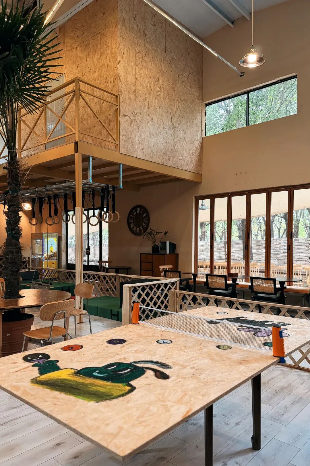 作为融合复古自然风室内空间与松弛乡野体验的复合型场地,Jolly Space拥有600平方米通透的室内区域,以及五亩多的私密户外森林。室内保留天然工业风,网球、匹克球场地、专业木工教室、儿童体能区、游乐区、阅读角与大舞台错落分布;室外林间,儿童体能空间、手工面包区、“鸭鸭幼稚园”、公益图书馆、户外音乐区等节点点缀其间,兼顾趣味性与体验感。