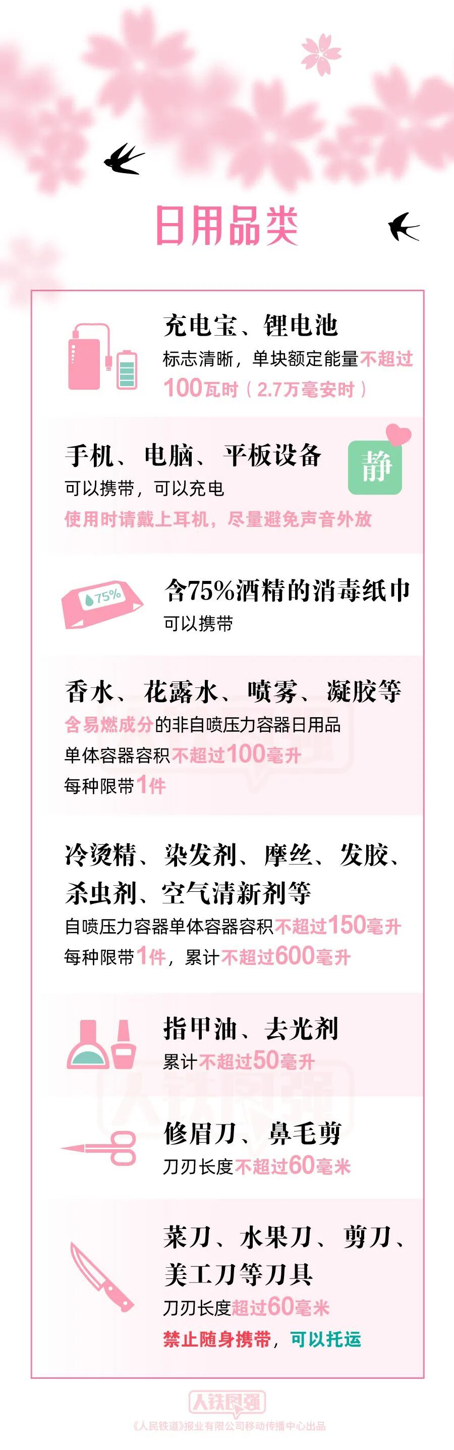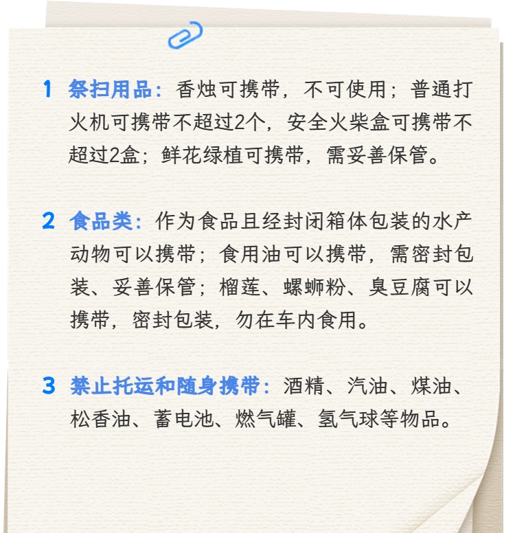 清明节在即,扫墓、植树、踏青、赏花正当其时。乘火车出行,哪些行李物品可以携带,哪些不能携带呢?以下常见物品清单,快来对照检查一下吧↓