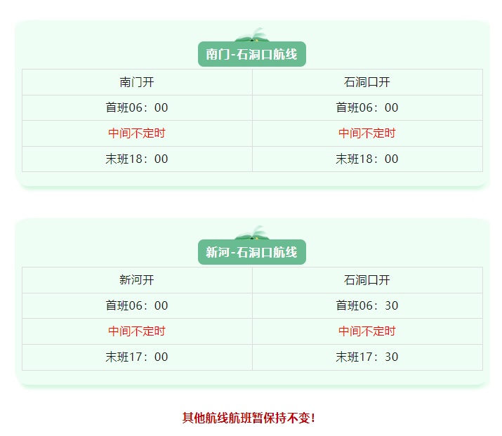 市客运轮船有限公司介绍,2026年4月4日至2026年4月6日“清明”假期期间,调整南门-石洞口、新河-石洞口航线车客渡航班计划,首末班航班定时开航,中间时间段视现场车客流情况实行不定时航班。2026年4月7日起恢复原有航班。请各位旅客相互转告。当天开航情况可拨打问询电话69693666或56152070,以免耽误您的行程。