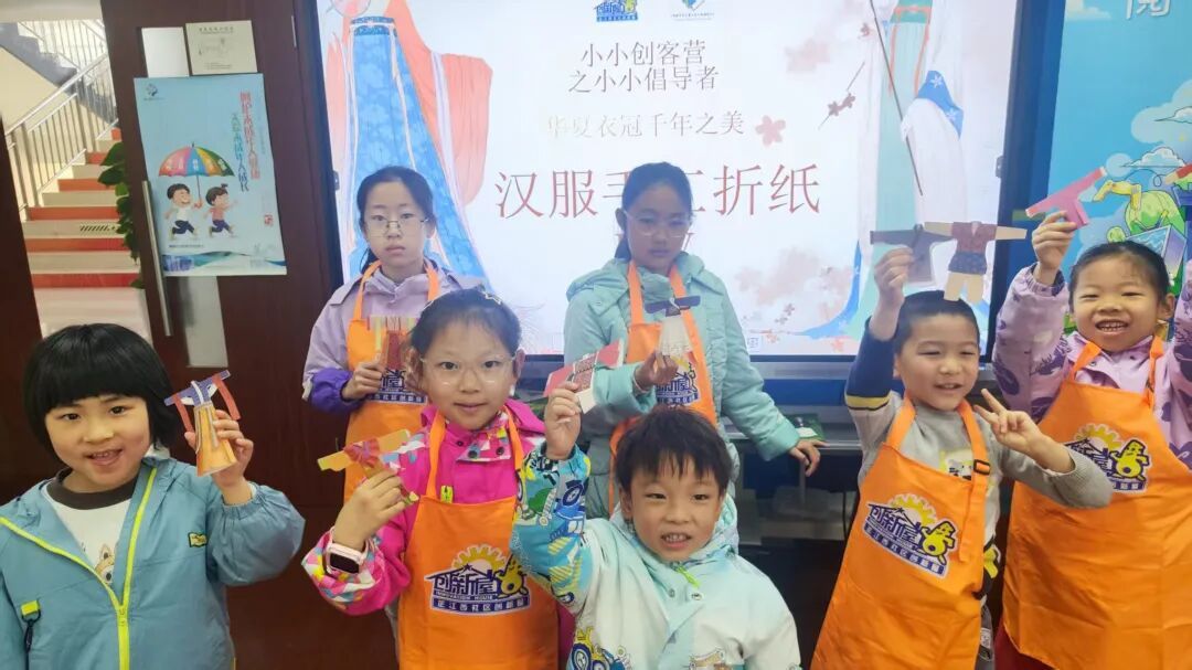 汉服折纸DIY环节,彩纸在孩子们手中变成了精致的“汉服”,一个个举着作品比谁做得漂亮。