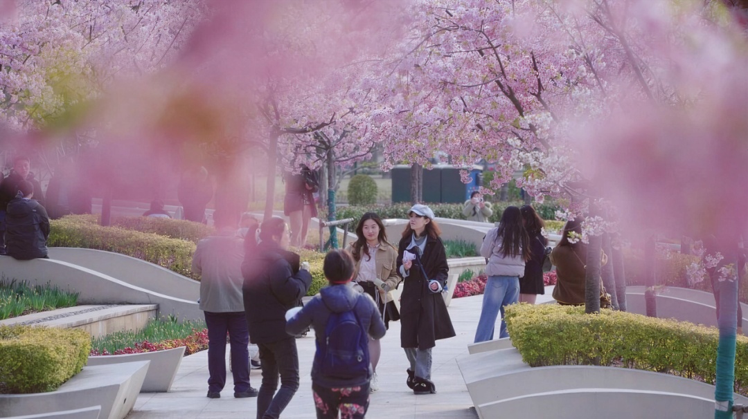 沿湿地赏花步道缓步前行,200余株河津樱迎来落花期,风过处,落英覆水,形成唯美的“樱花水岸”。之后,晚樱会接力绽放,重瓣浓粉色花团缀满枝头,花期可延续至4月中旬。