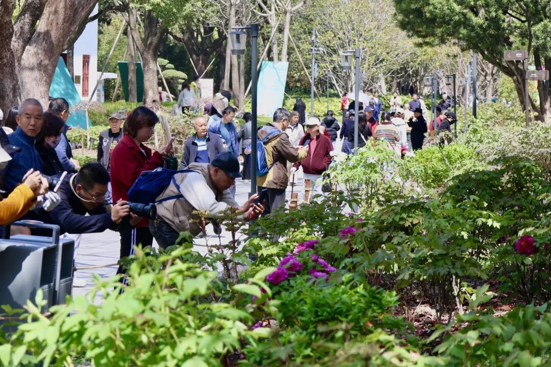 上午九时,公园内已是游人如织,赏花客不在少数。人们穿梭于花丛间,或细细端详,或拍照留念,沉浸在盎然春意与馥郁花香之中。映衬着花开美景,平日里来漕溪公园练歌的社区合唱队也兴致盎然地唱起《牡丹之歌》。