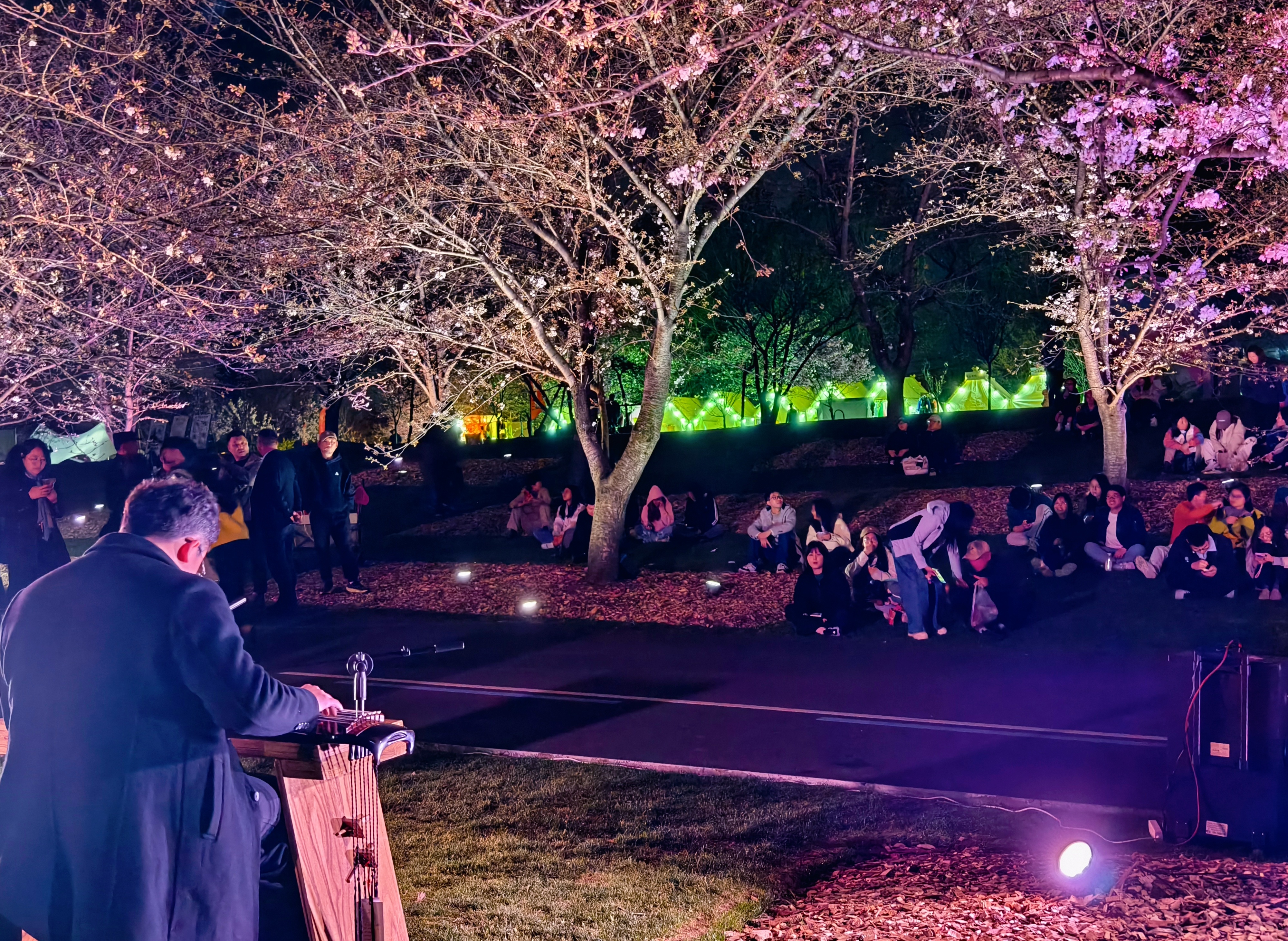 现场的“樱花树下”艺术快闪里,文艺志愿者们或是端坐樱花树下弹奏古筝、古琴,任悠扬的曲声从指尖流出,于夜色中婉转流淌;或是水袖翻飞,唱一曲《惊梦》,演绎摇曳春色。道旁的游客们也不约而同地席地坐在树下,在纷纷扬扬的樱花雨里静静聆听,乐享国风浪漫。