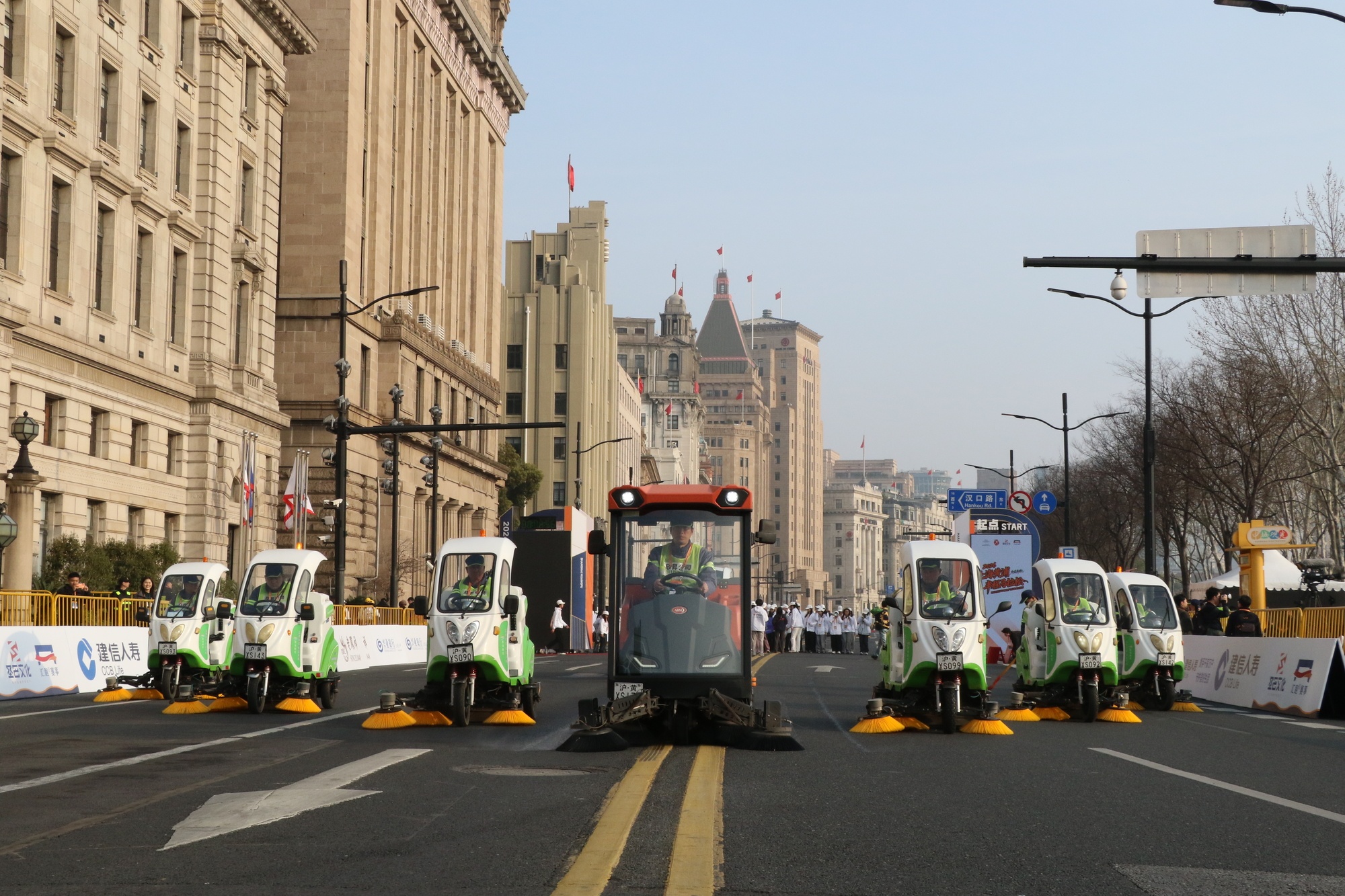 春风拂岸,跑者集结。随着最后一批跑者冲出起点线,14辆新能源扫路车、6辆新型电动机具,两支雁形机械梯队迎面而来,依次进行保洁。8分钟后,马拉松赛道已恢复如初。