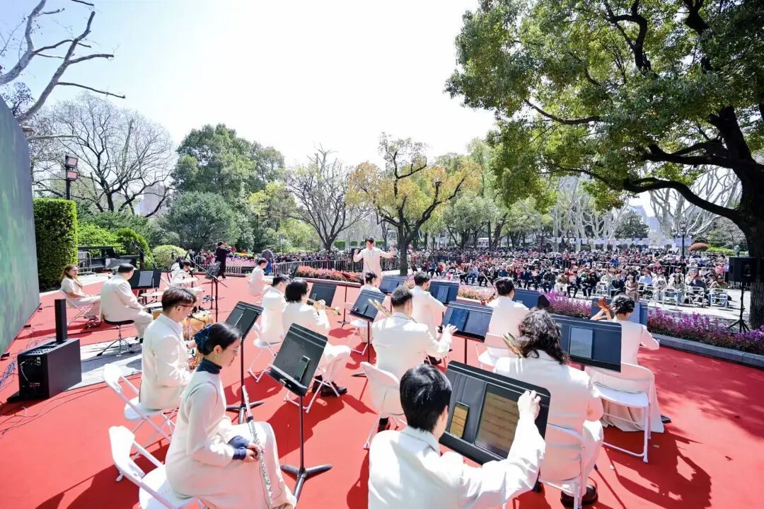 作为活动重磅环节,“百年交响·烟火乐章”专场演出精彩上演。上海轻音乐团倾情献演,融合西方经典交响与上海本土曲目,演绎《春之声圆舞曲》《夜来香》等作品,致敬1926年梅百器在虹口公园奏响的首场露天交响音乐会,延续百年音乐文脉。下午,上海四季爱乐乐团接续演出,用经典乐章展现市民对交响乐的热爱。