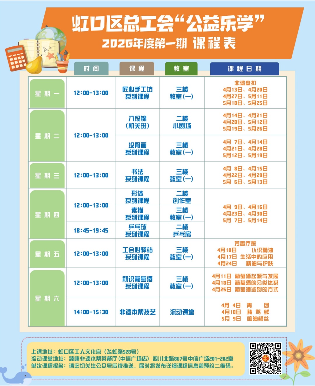 公益免费:名额有限、每人限报两门、手慢无;高效充电:午间不虚度、晚间有温度、周末更充实;专属定制:虹口区总工会出品、紧扣职工需求。