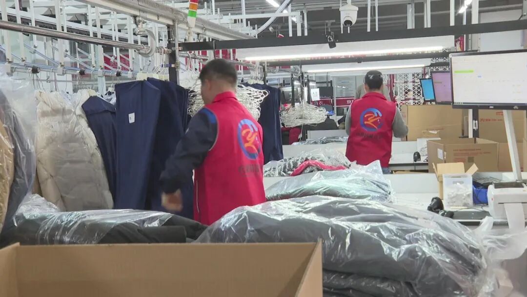 走进工厂,繁忙而有序的景象扑面而来。通道旁新增的收货整理台上,一框框按标准分类好的衣物正待处理;一排排长衣架上挂满待发的成品。据工厂新媒体部门主管范昭介绍,近期市民换季洗衣热情高涨,工厂日清洗量已突破一万六千件,员工采用三班倒机制,工作时间从早8点持续至次日凌晨两三点。虽然业务量骤增,但工厂通过细化分类标准——从大件、小件到薄厚、深浅,确保了生产“乱中有序”,并配以奖励机制,员工干劲十足。