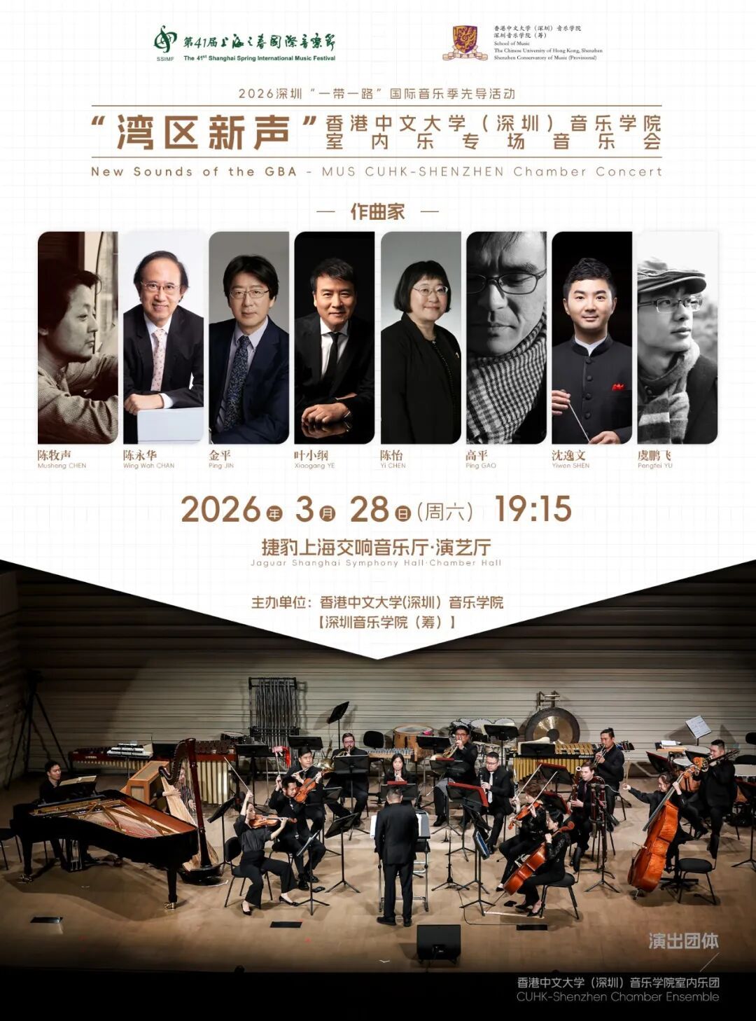 同日晚,深圳“一带一路”国际音乐季推荐的“湾区新声”香港中文大学(深圳)音乐学院室内乐专场音乐会在演艺厅上演。香港中文大学(深圳)音乐学院室内乐团集中演绎了包括叶小纲、陈牧声等中国顶尖作曲家力作。曲目编排既回溯中国当代音乐创作的发展脉络,又凸显湾区作曲家的创新活力,全方位展现了中国作曲家在室内乐领域的多元探索,为观众带来兼具学术深度与听觉震撼的艺术体验。深圳“一带一路”国际音乐季节目总监、香港中文大学(深圳)音乐学院演出与艺术实践办公室负责人朱千峰表示,这是香港中文大学(深圳)音乐学院代表深圳“一带一路”国际音乐季首次登上“上海之春”这一历史悠久的平台,很感谢组委会能够给予我们这个机会展现深圳在创作以及演奏上的一些成果。这是一个很好的开始,希望未来也能邀请其他三节的艺术家或者是项目来到深圳。