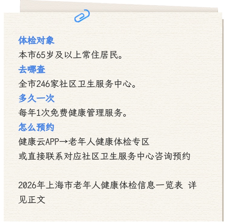 内容涵盖生活方式和健康状况评估、体格检查、辅助检查和健康指导等,为每位老年居民提供专业的健康关怀和健康指导。2026年度的体检开始啦,服务信息公布如下↓