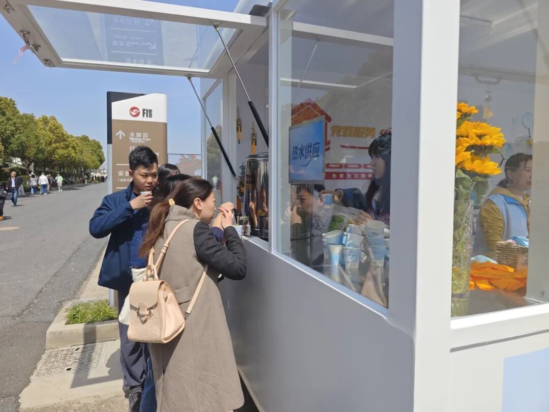 上午9点,徐泾西园已经迎来了大批祭扫市民。位于广场东侧的党群服务驿站成了不少市民入园后的第一站,这里不仅能为访客提供祭扫相关问题的咨询,还免费提供热饮、应急药品、轮椅租借、物品寄存等便民服务。市民张老伯一大早从闵行赶来扫墓。舟车劳顿的他进园后选择先到驿站歇歇脚。志愿者递上一杯热饮让他暖暖身子,贴心周到的服务让老人家连连称道。“对我们来扫墓的老百姓来说,这里的服务蛮周到,有热茶喝,有什么事情找党员志愿者,她们都会帮我们解决。”