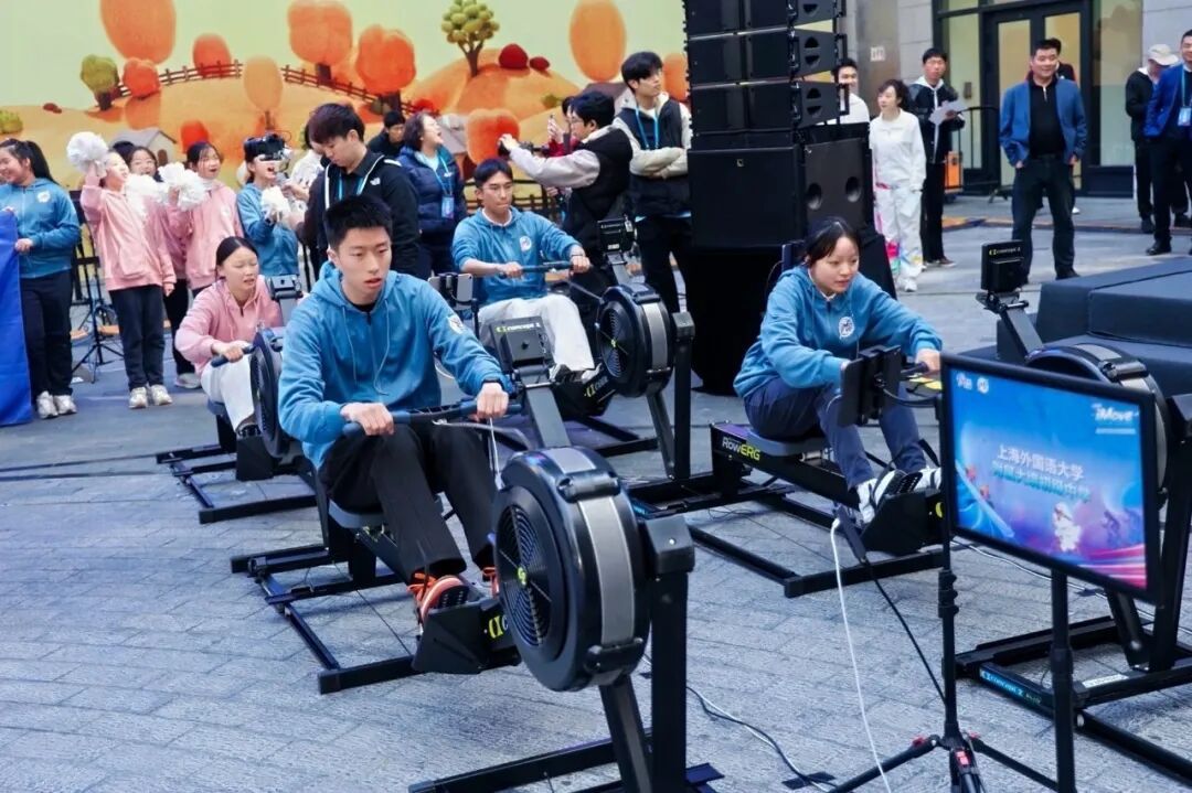 现场,200米混合师生双人双桨虚拟赛艇火热开赛——师生同频发力、默契配合,智能设备实时捕捉数据,大屏特效画面引爆全场。从讲台到赛道,老师们以“并肩作战”的方式陪伴学生成长,这正是黄浦健康守护者的生动注脚。