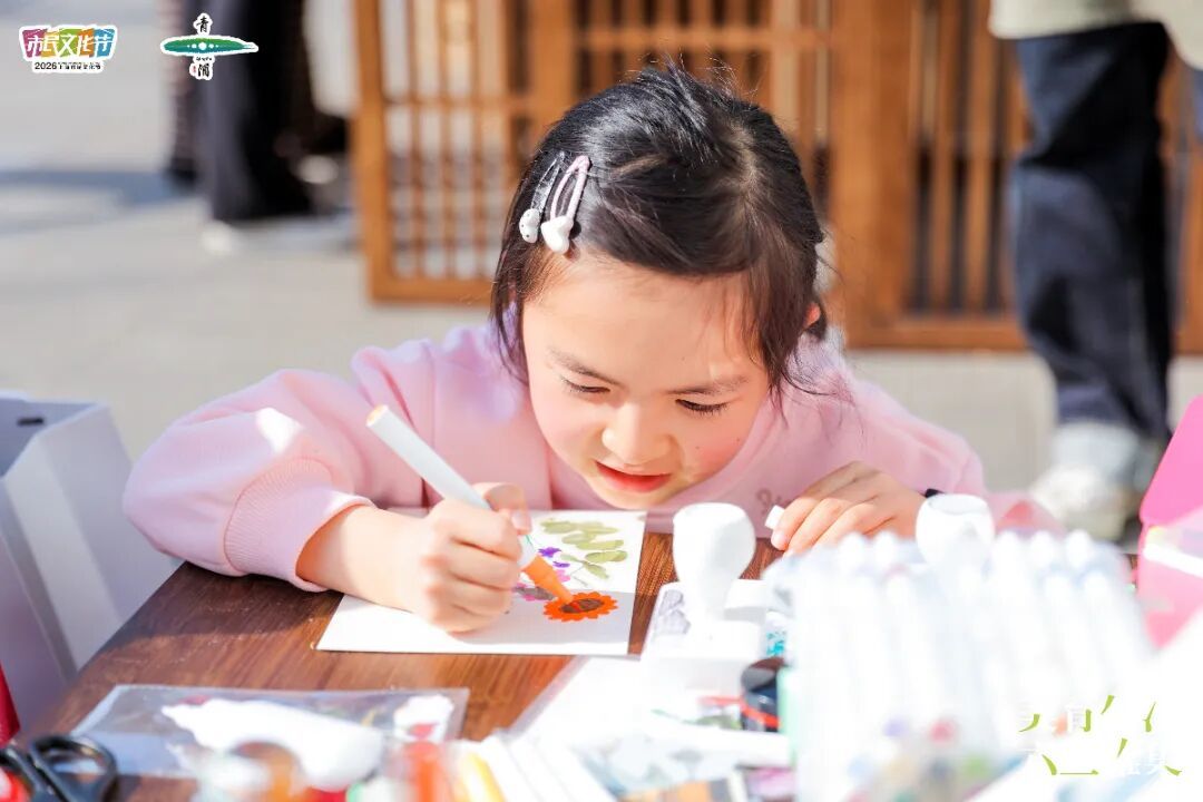 最有趣的是青浦图书馆带来的“书间藏春序”互动区。不少小朋友和家长围坐在一起,用画笔和春日主题的贴纸,共同创作一本名为《春天经过的时候》的手作书。阅读不再是安静的翻阅,而是变成了充满欢声笑语的创意共创,让春天在指尖“活”了起来。