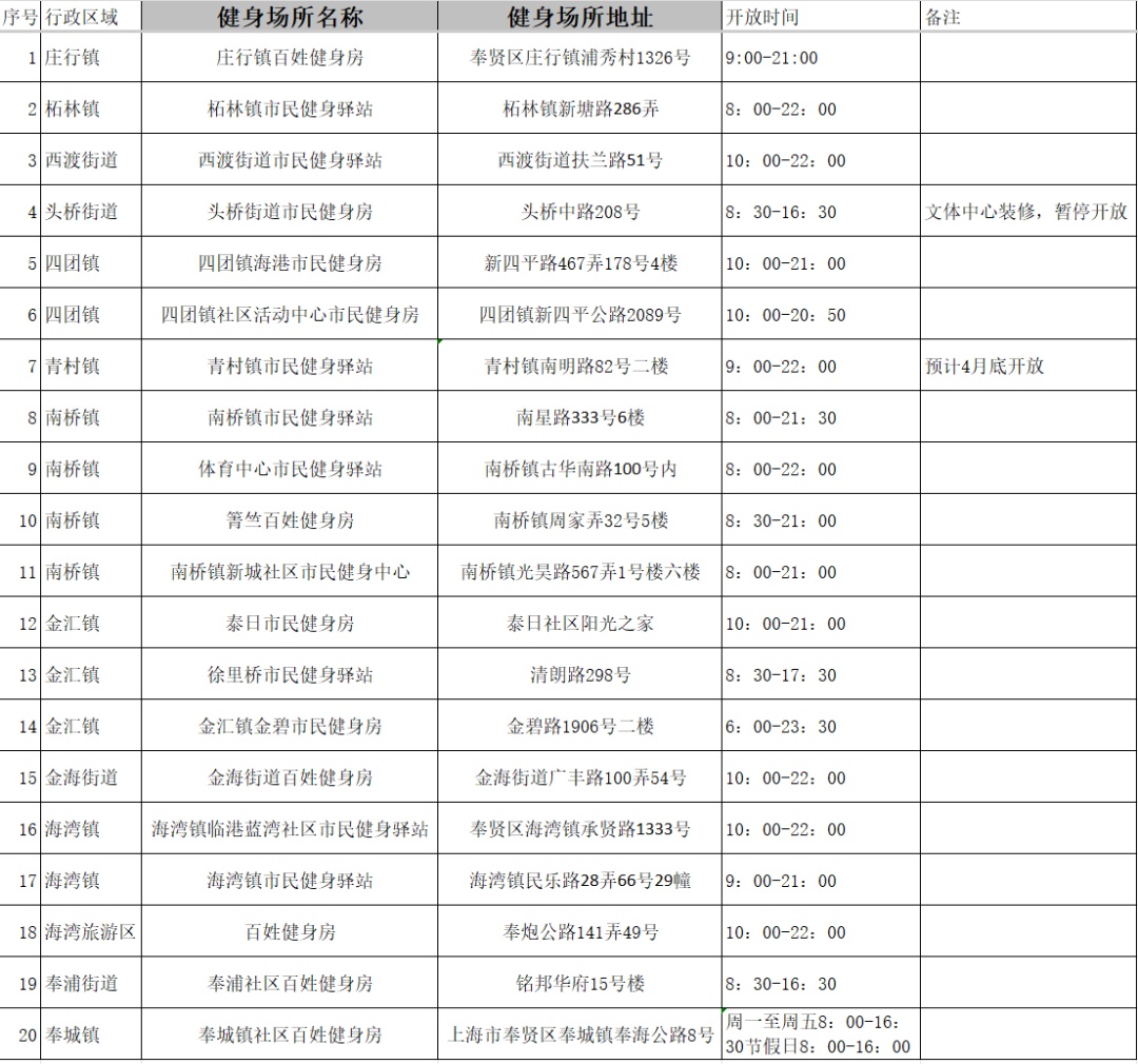 奉贤区的公益健身房已经实现街镇全覆盖啦!每个角落都有让你“暴汗”的好去处。具体名称和地址?别急,“贤小融”已经为你准备好啦!(附上图片,快保存哦)