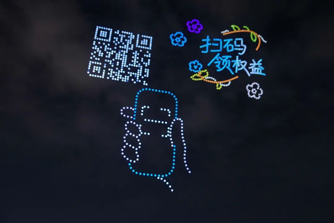 表演以科技创新点亮消费场景。无人机编队在空中实时组合呈现