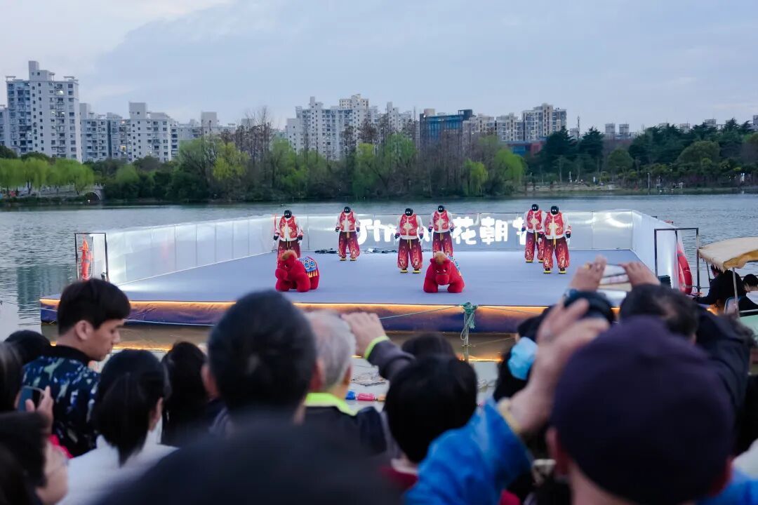 千架无人机以夜空为幕、以流光为笔,依次呈现骏马奔腾、月下花神、十二花影次第绽放、繁花锦束、花船漾湖、音乐喷泉等公园代表性地标以及大宁功能片区重点产业等画面,将千年花朝古韵与现代科技、城市活力完美交融,带来震撼人心的沉浸式视听盛宴。夜色温柔,春风拂湖,天上星河璀璨,地上花香满城。