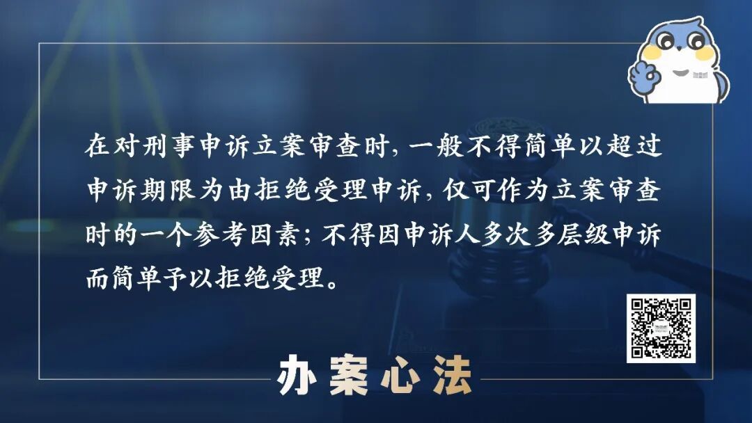根据现行《刑事诉讼法》及配套司法解释,一方面符合条件的申诉应尽量在上述规定期限内申诉,另一方面,司法实务中一般不得简单地以超过申诉期限为由拒绝受理申诉,该期限仅可作为立案审查时的一个参考因素。