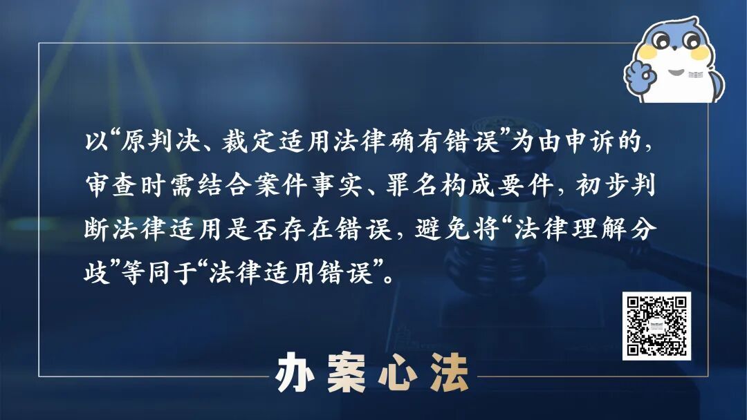 审查时需结合案件事实、罪名构成要件,初步判断法律适用是否存在错误,避免将“法律理解分歧”等同于“法律适用错误”,同时应尽力做好申诉人的沟通罢诉工作,不简单作为立案复查事由。