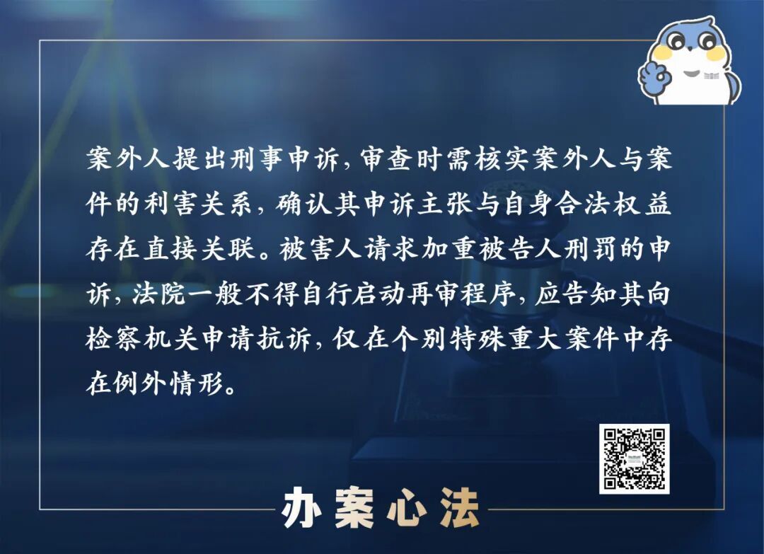 案外人认为已经发生法律效力的判决、裁定侵害其合法权益的,也可以提出申诉,审查时需核实案外人与案件的利害关系,确认其申诉主张与自身合法权益存在直接关联。司法实务中,案外人提起申诉不以没收、追缴财产在其名下为必要条件,也无需以提出执行异议为前置程序,只要认为原审裁判侵害其合法权益即可,且个人或单位均有权提出。但非法传销案、非法集资案中的投资(出资)人申诉主体资格存在争议,此类主体兼具受害者与违法者双重身份,相关规定明确对集资参与人提起的附带民事诉讼不予受理,其能否作为案外人申诉需结合案件具体情况综合判断。