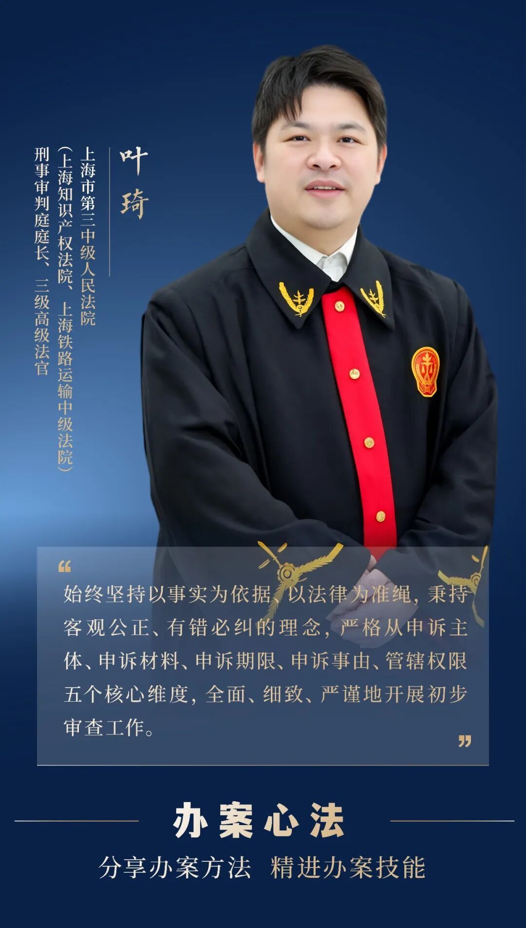 本期“办案心法”栏目,邀请上海法院审判业务专家,上海市第三中级人民法院(上海知识产权法院、上海铁路运输中级法院)刑事审判庭庭长、三级高级法官——叶琦为我们讲解刑事申诉立案审查思路及要点。