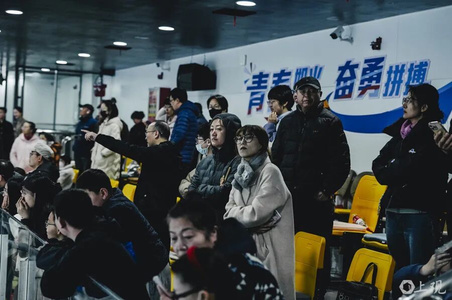 如果你以为这就是冰壶“演奏会”的全部,那可就错过精华部分了。10时整,比赛开始,除了之前适应场地时已经出现的几种声音,还有两个最关键也是最“抓耳”的声部登场——选手的呼喊声和现场观众因为各种情绪发出的声音。“8秒”“右一点”“下线,注意下线”“好球”每位参赛选手除了手上功夫过硬,还需要一个标配——大嗓门。同一时刻,观众席里也热闹非凡,不少懂行的申城冰壶爱好者正在讨论下一次投壶是要打甩还是占位,几个在家长陪同下前来体验赛场氛围的孩子也加入进来,让讨论更加热闹。