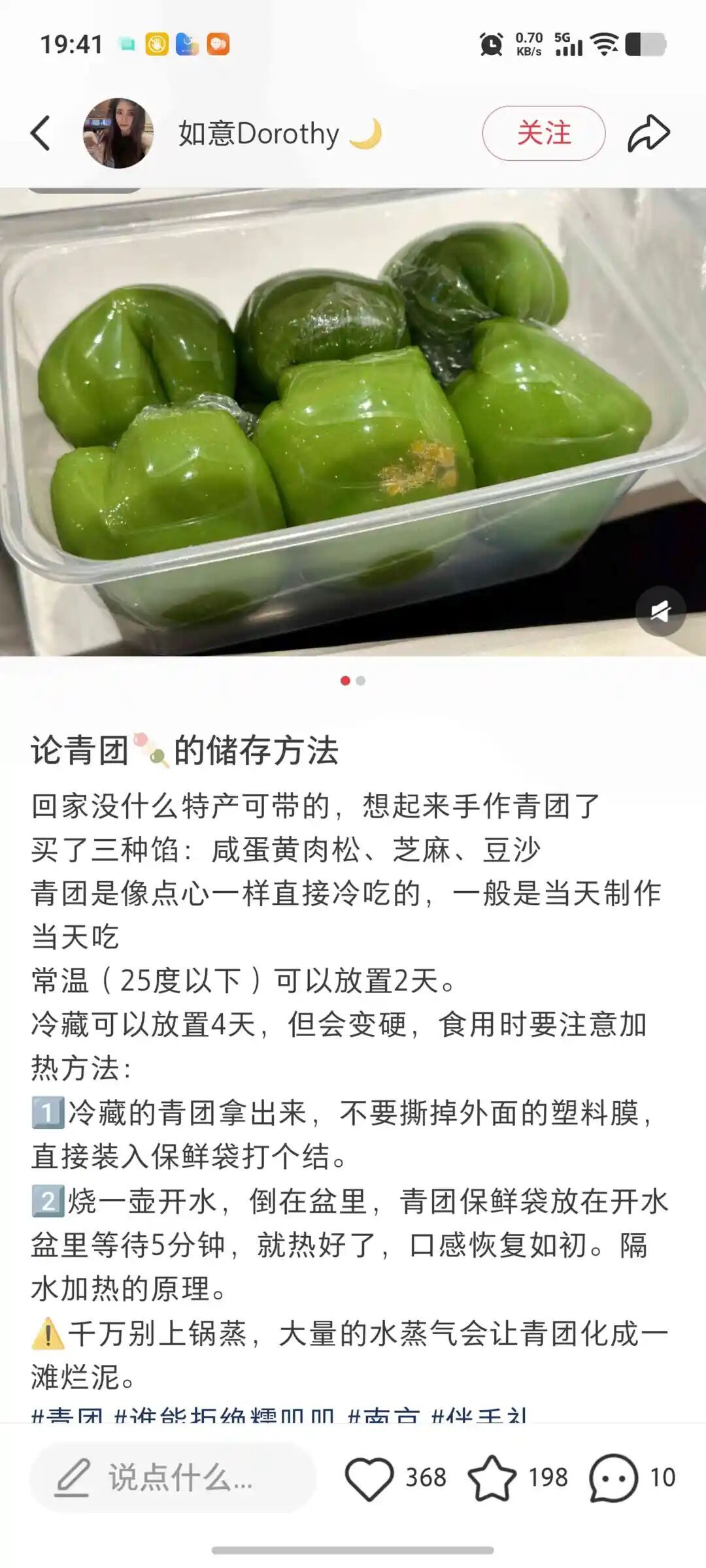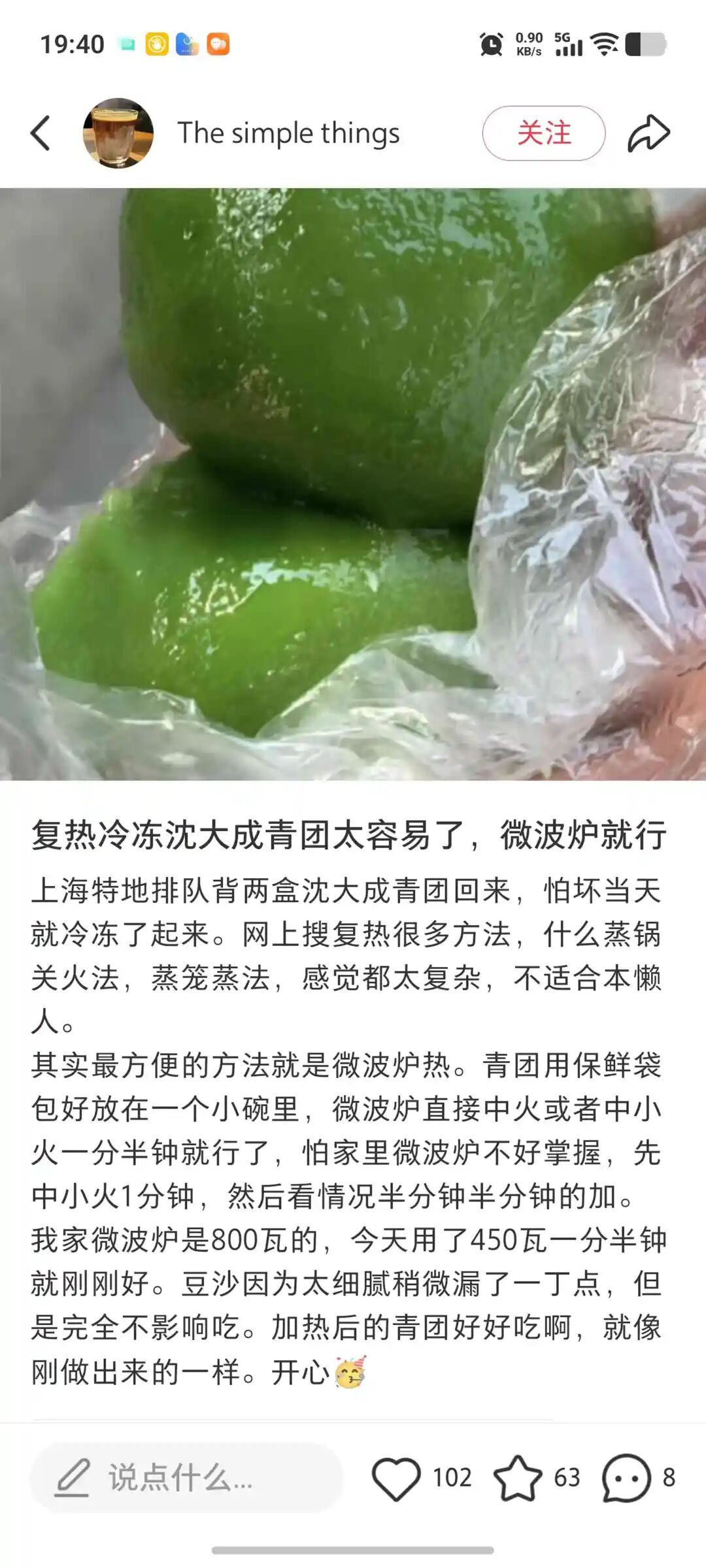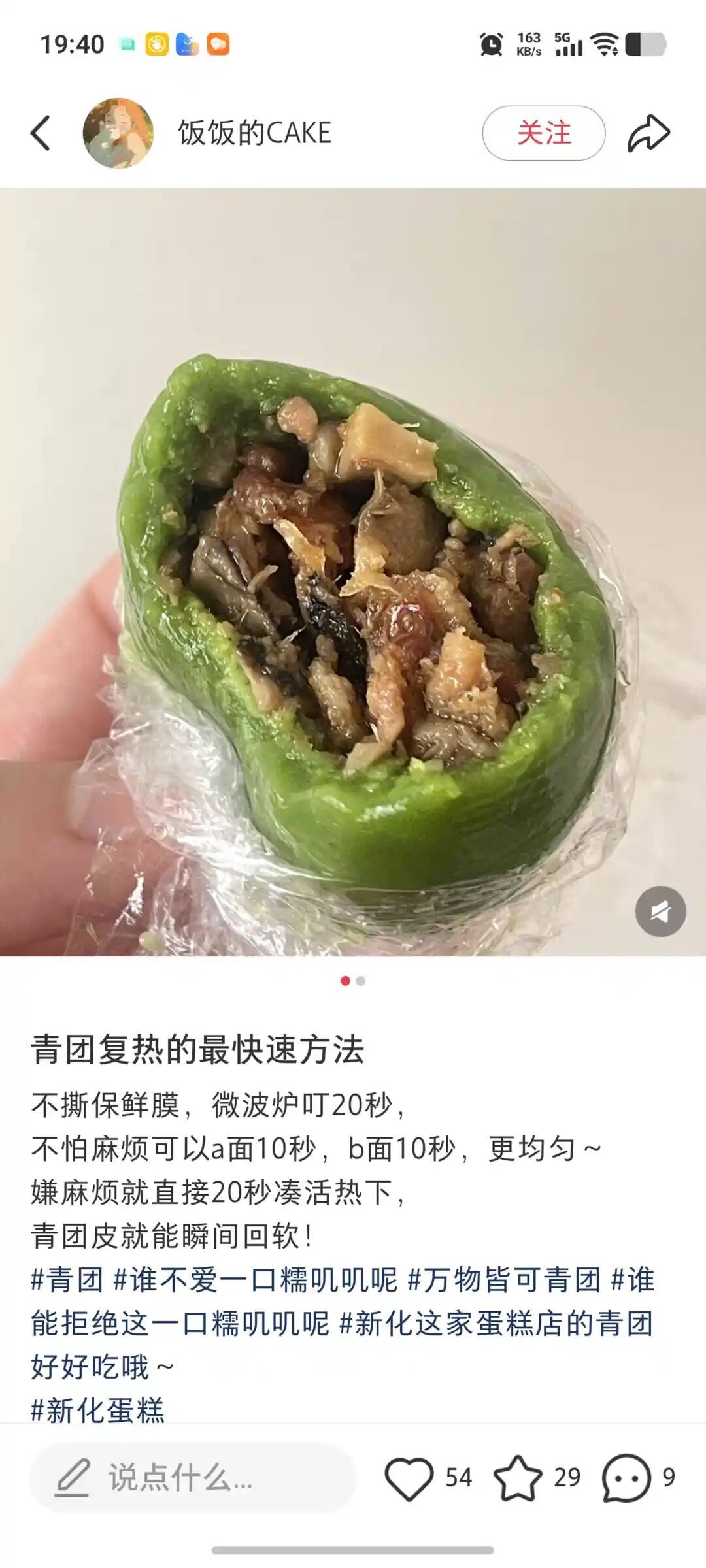 这里还有个小细节:如果青团冷藏时间比较久,比如放了两天,就可以适当延长几秒加热时间,但切记不要超过40秒,不然就会变成“塌塌团”哦~