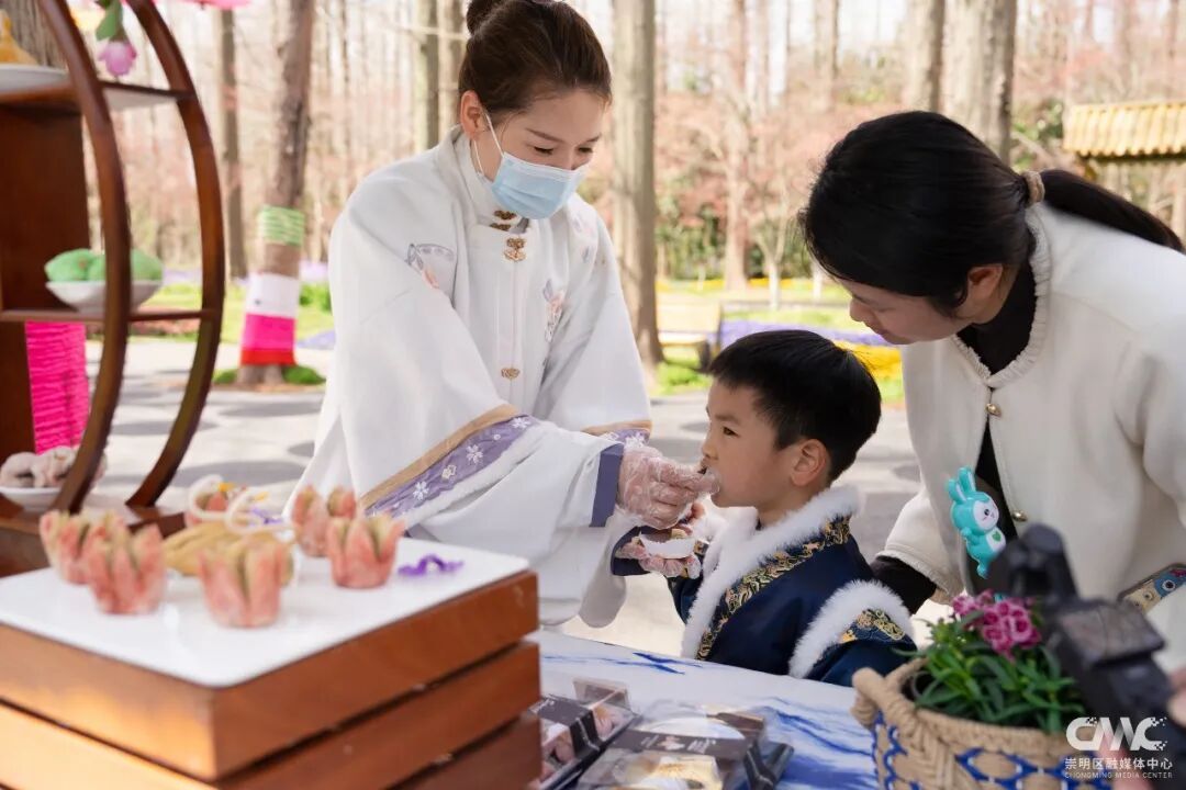 此时,公园内也已热闹非凡。“遇见好时光”花朝市集上,琳琅满目的手工艺品、鲜花花艺、崇明好物和传统小吃应有尽有,还有崇明土布、漆扇制作、麦秸秆画等传统文化展示活动和互动体验。逛累了就坐下来品尝一下花糕花饼,赏春之余也食春。“吃喝游玩购全都有!”市民游客穿行其间,一边是繁花似锦的春日园景,一边是热闹质朴的花朝市集,令人沉浸其中,流连忘返。