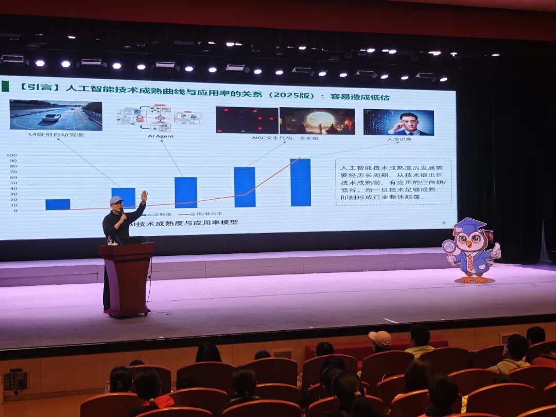 活动现场,蒋老师以清晰的逻辑、生动的案例,带领同学们走进人工智能的世界。他从人工智能的发展历程讲起,梳理了从图灵测试到ChatGPT、通用AI Agent等关键节点的技术突破,解析了深度神经网络、人形机器人等前沿成果,让同学们直观感受人工智能从“实用突破”到“认知革命”的演进历程。