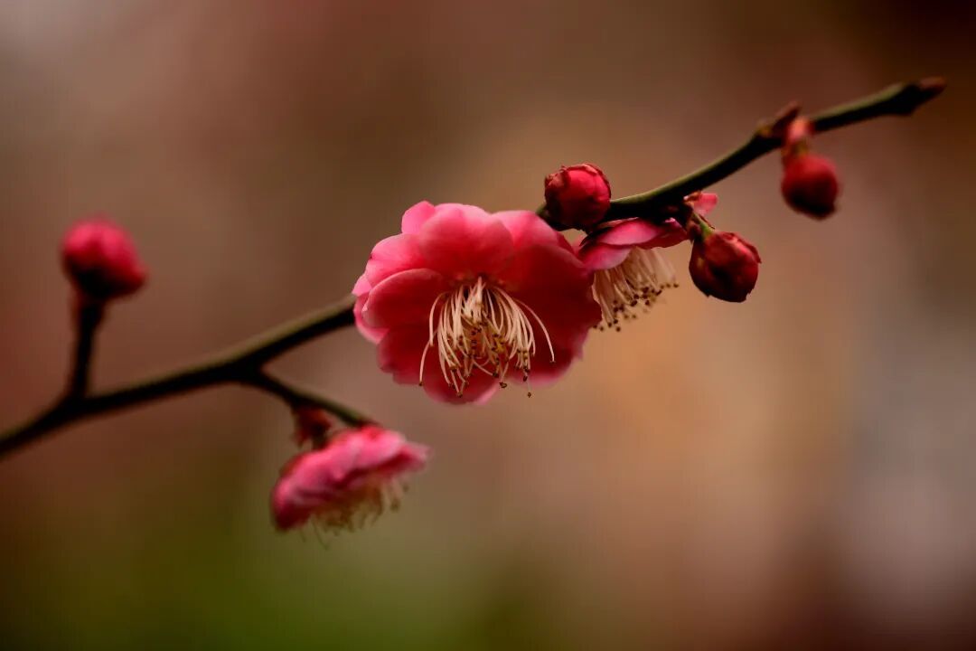 梅花是这几种花中开放最早的,花期通常集中在2月至3月上旬,属于冬末春初的时令花卉。梅花的一大特点是“先花后叶”,花开时枝干上完全没有叶子,待花朵凋谢后才慢慢长出叶片。梅花的花朵几乎是贴梗而生,花梗极短,看上去像是直接贴在枝条上。梅花花瓣接近正圆形,花朵小巧,花色有白、粉、深红等多种,花蕊呈淡黄色,整体气质清雅。此外,梅花多为单朵着生在枝条上,一个花芽只开出一朵花。