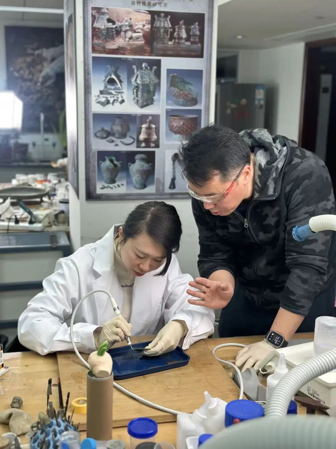他系统总结实践经验,出版专著并参与教材编写《中国古代青铜器保护与修复》《青铜器修复与复制基础》,为行业研究与人才培养提供重要参考。同时,积极构建“师徒传承+高校教学+行业培训”多层次人才培养体系,推动非遗技艺的系统传承与可持续发展。