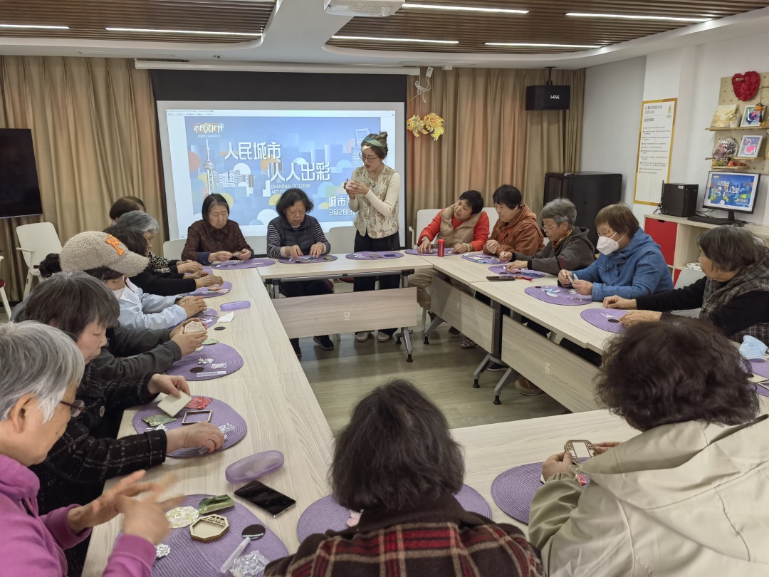 在红馨“生活盒子”现场,苗银饰片、宋锦面料、冰箱贴基底等材料分门别类摆放整齐。手工老师介绍了苗银与宋锦的工艺特点,讲解苗银的质朴灵动从何而来,宋锦的纹样美学又精妙在何处,并通过实物演示裁剪、搭配、粘贴、装饰等步骤。动手环节气氛热烈,不一会儿,一枚枚融合苗银与宋锦特色的冰箱贴便呈现在桌上。居民们拿着成品拍照,笑着说没想到自己也能做出来,不少人感慨,原来非遗离生活并不遥远。