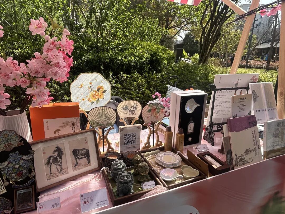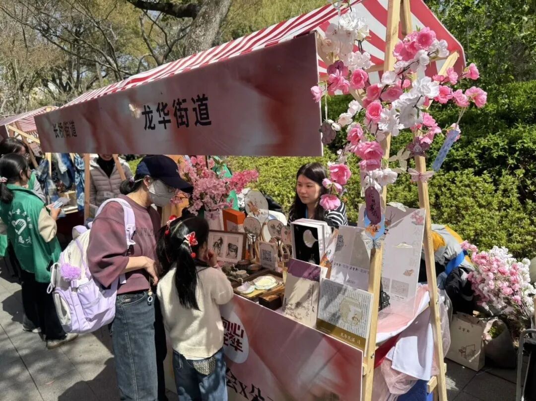 与此同时,在“美遇徐汇 艺起绽放”2026年上海市民文化节徐汇区“城市美育日”主题活动现场,龙华街道国家级非遗项目“上海龙华庙会”与同为国家级非遗项目的“朵云轩木版水印”联手打造“龙华庙会X朵云轩”摊位,推出琳琅满目的非遗展品及文创作品。《龙华庙会》《龙华民谣》等书籍静静陈列,吸引往来市民驻足翻阅;朵云轩的文房礼盒、“千里踏风”木版水印、朵云小团扇等作品雅致陈列,既承续传统年俗的韵味,又贴合现代生活的审美意趣;摊位上装饰的桃花,宛如春天写在枝头的感叹号,吸引不少市民驻足围观。