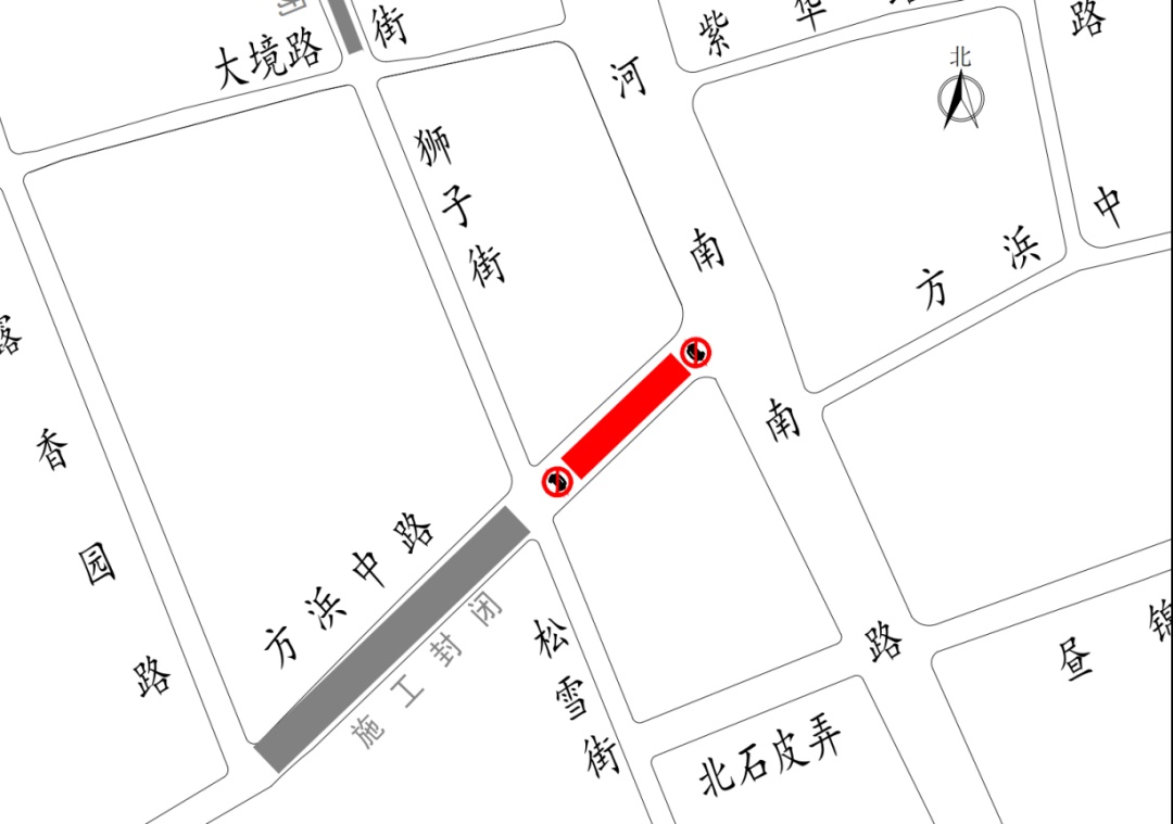 3月27日至6月底,方浜中路(松雪街/狮子街-河南南路)实施全封闭施工。为配合其架空线入地工程,周边道路交通组织相应调整,具体交通组织方案如下: