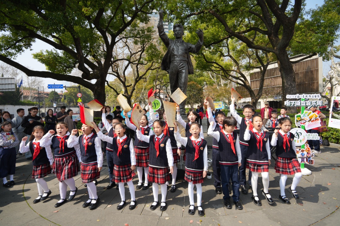 行至聂耳音乐广场,电子键盘模拟的海浪声此起彼伏。上海音协电子键盘专委会艺术团、爱菊小学学生与徐汇区教育学院的老师们,以电子键盘、合唱、舞蹈和竹笛带来现场演出。几位参演小朋友也身着“小报童”服装,在电子琴前认真演奏《卖报歌》《渔光曲》的经典旋律,吸引路人纷纷驻足。在指导老师的帮助下,不少市民也上前尝试弹奏,在梧桐树下与“人民音乐家”隔空对话。