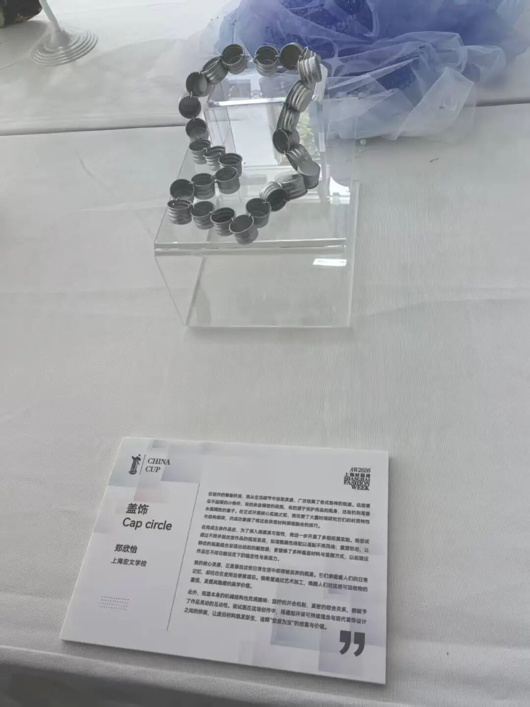 上海宏文学校郑欣怡创作的配饰“盖饰”,上演了一场“垃圾变宝藏”的魔法。她从生活细节中汲取灵感,收集了各式各样的瓶盖——药瓶的、洗护用品的、香水瓶的……在掌握异质材料焊接技巧后,她将这些“废品”变成了充满艺术感的配饰。她还通过调整颜色、重塑形态、更换基底材料等探索,让静态的瓶盖组合呈现出动态的造型感。“这些瓶盖承载着人们的日常记忆,却往往在使用后便被遗忘。”郑欣怡说,“我希望通过艺术加工,唤醒人们对这些可回收物的重视,让废旧材料焕发新生。”