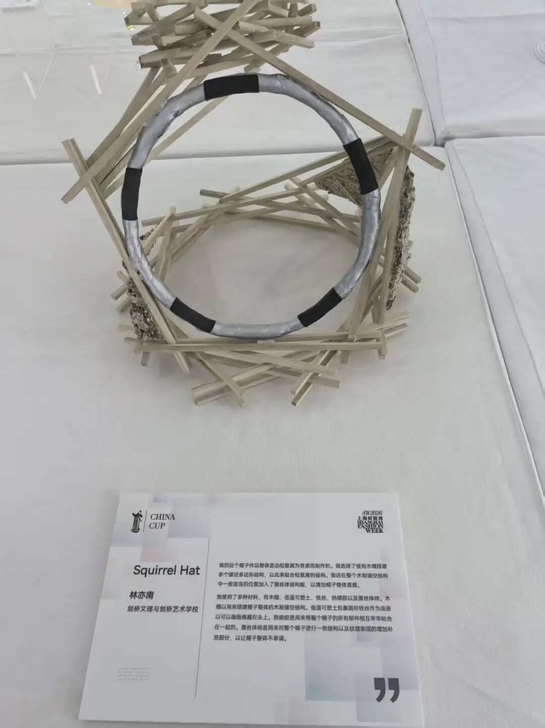 剑桥文理与剑桥艺术学校林亦南的设计更有趣——她把松鼠窝变成了帽子。用木棍搭建镂空多边形结构,模仿松鼠窝的自然形态;在适当位置嵌入菌丝体结构板,增添独特质感;再用低温可塑土包裹铁丝做底座,确保佩戴稳固。木棍、菌丝体砖、热熔胶……这些看似“不时尚”的材料,在她手中变成了充满自然气息的时尚单品。“我想让帽子的每个角度都有故事,”她说。