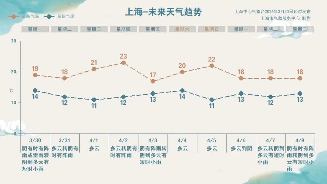 今日(3月30日)申城阴有阵雨或雷雨,局部雨量达中到大雨。今日最高气温19℃,湿度95%~80%,体感湿闷。