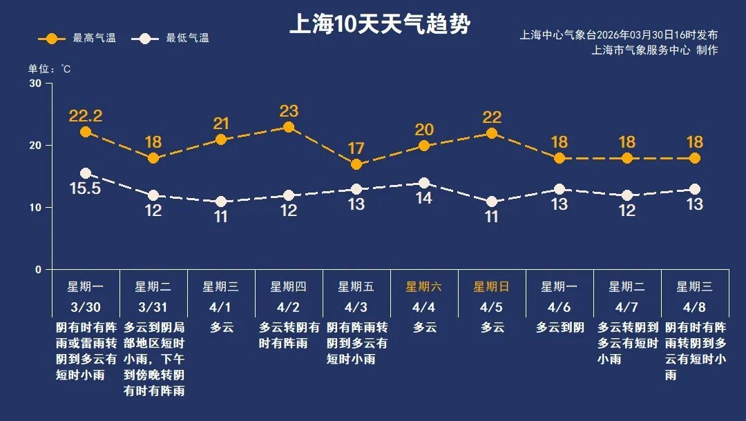 周三至周四白天,上海多云为主,阳光加持下,周四最高气温直冲23℃。受西南暖湿气流影响,周四夜里至周五,上海又将有一次较为明显的降水过程。周六周日天气转好,最高气温又将冲上20℃。下周一云系增多,气温回落。春季晴雨切换频繁,请及时关注最新的天气预报信息。