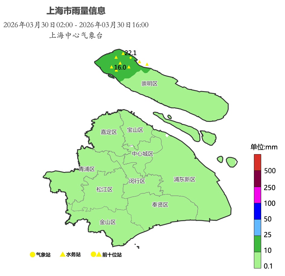 受江淮气旋影响,今天凌晨开始,上海陆续转雨,大部地区为小雨,崇明西北部地区有中雨。3月30日02时到16时雨量统计显示,崇明新村乡22.1毫米为最大,徐家汇站为3.2毫米。今天的气温南北差异明显,17时,崇明气温只有15.7℃,而金山则有22.3℃。加上今天的湿度较大,体感有些闷。