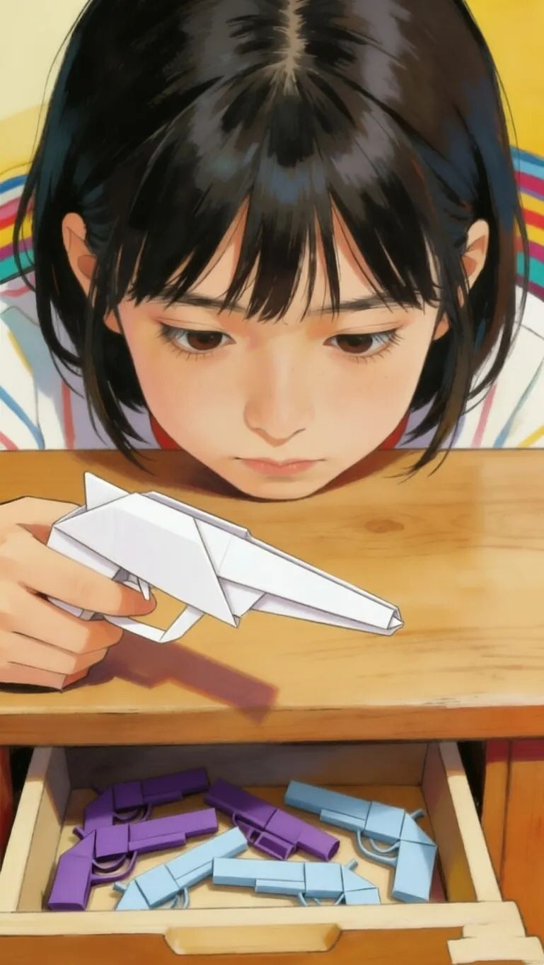 小学三年级,同学之间流行起折纸枪,大家用不同的纸张折叠、拼装出各式各样的手枪、狙击枪,有的甚至还能上膛、连射。一到课间,大家便纷纷拿出自己的宝贝,比试精美程度、发射距离和威力强弱。我也热衷参与,不亦乐乎。记得有一种纸枪做起来很费功夫,做一把往往需要两周时间。网上没有教程,只能自己慢慢琢磨,一开始总折不好枪管连接处,或是无法发射,或是卡壳,又或是不满意外观。这令我一度气到把所有零件扯个稀烂,好像这样就能把那些反复失败的懊恼也一并撕碎。
