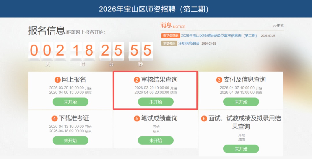 五、招录程序 01.上报计划 各单位在核定的编额内制定上报招录计划,经教育局审核同意后,报上级部门审批。 02.发布公告 经上级部门审批同意,由教育局统一发布招聘信息。 03.报名受理 应聘者进行网上注册报名,用人单位实行网上预审并确定应聘初选人员。【网上报名通知另发,请关注“宝山教育信息网—(https://www.bsedu.org.cn/)—专业平台—教师招聘”或“宝山教育公众号”】 04.组织笔试 初选人员由教育局上报参加笔试,笔试包括“综合测试”和“学科测试”两个项目,其中有一项不合格者即予“淘汰”,两项均合格者继续进入面试。应聘者已参加2026年宝山区师资招聘(第一期),“综合测试”合格,但未达成录用意向的,可在第二期再作选择,情况分为以下两种: ①“学科测试”合格但未录用,可在第二期选择相同学科的职位竞聘(原笔试成绩有效);也可重新选择其他学科的职位竞聘并参加该职位对应的“学科测试”,合格后进入面试环节。 ②“学科测试”不合格,可在第二期重新参加该学科或其他学科的“学科测试”,合格后进入面试环节。应聘者已参加2026年宝山区师资招聘(第一期)“综合测试”,成绩不合格者不得参加第二期师资招聘。 05.组织面试 高中学段由用人单位统一组织,初中、小学、幼儿园学段由教育局统一组织,成绩合格者继续进入试教,不合格者即予“淘汰”。同时对应聘者的资格条件及应聘材料真实性进行审核。 06.组织试教 由用人单位统一组织,成绩合格者纳入总分值测算,不合格者即予“淘汰”。 07.择优录用 用人单位根据笔试、面试和试教成绩计算总分值【笔试占30%(2项笔试各15%)、面试占30%、试教占40%】,并按总分排序择优确定“拟录用”人选。 同时,各招聘单位可根据教育局规定流程,在符合条件但未被拟录用的应聘者中,进行双向再选择,确定双向再选择“拟录用”人选。 08.组织体检 招聘单位通知“拟录用”人选参加体检(2026年获取教师资格证的人员可免体检)。 09.确定人选 用人单位根据体检结果对“拟录用”人选作出综合评定,并确定拟正式录用人员。 10.材料送审和组织公示 用人单位对拟正式录用人员制作送审材料并报区教育工作党委组织人事科,经审核后报局领导复核,再报上级部门审批,同时组织公示。 11.办理录用手续 经批准录用的人员携相关材料到用人单位报到,同时与用人单位签订《聘用合同》,并办理聘用登记和社保缴费等手续。 教师招聘(第二期)报名流程 平台报名时间: 3月29日10:00~4月6日15:00 平台缴费时间: 4月7日10:00~4月9日15:00 (如有变化以平台公布时间为准) 复制以下网址,打开浏览器粘贴 可进入 http://218.80.196.173/website/ecloudform/2603251613 宝山区教师招聘报名步骤 宝山区师资招聘岗位信息 宝山教育,期待你的加入! 近期,宝山区人才局为广大来宝山求职或短期实习的各类青年人才推出了“青年驿站”服务举措,对就读高校和户籍所在地均为宝山区以外、有意到宝山区就业创业的毕业两年内(含)高校毕业生或在校生免费提供最高30天的临时住宿服务。具体政策请关注推文“致青年朋友们的一封信”。 扫码阅读《致青年朋友们的一封信》全文 提醒:房源有限,先到先得,以最终住房确认信息为准。