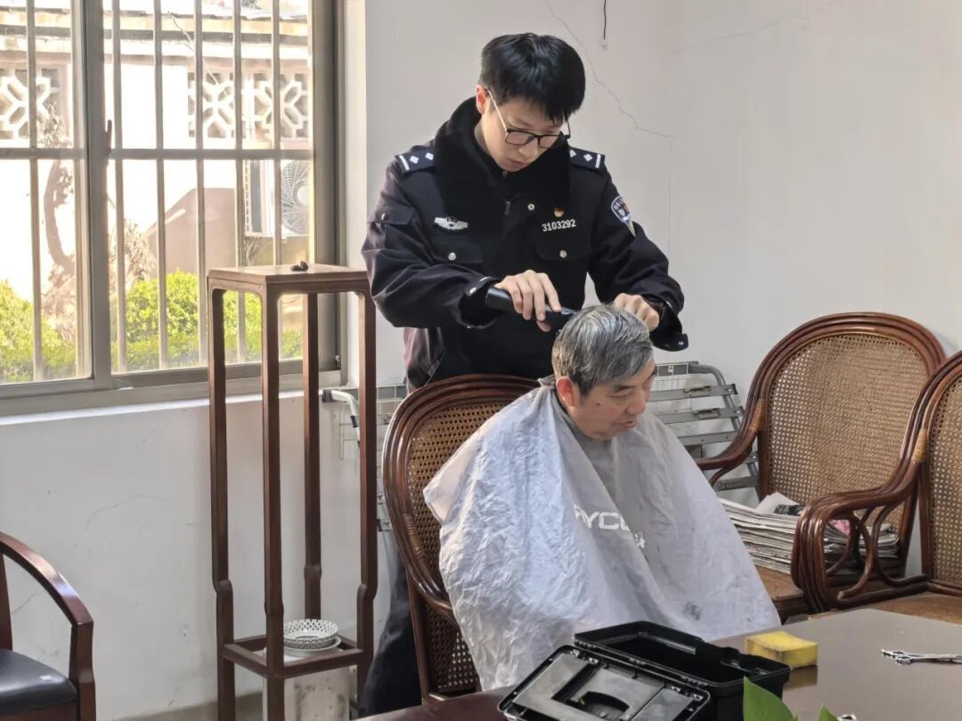 一把剪刀、一本反诈手册、一次暖心陪伴——在周浦镇公元新村,青年民警为老人们送去“春日温暖”。义剪摊位前,民警手法利落,剪刀翻飞间,老人们的笑容多了起来,有的打开话匣子:“小伙子剪得好,人更暖!”