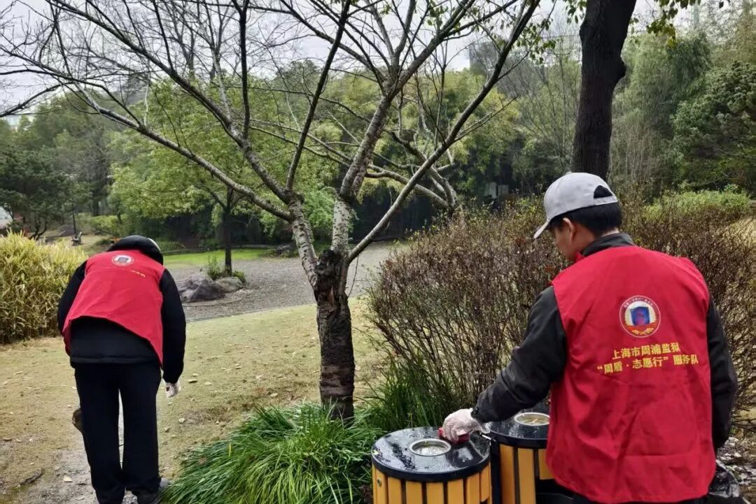 不远处的周浦公园和沈梅路街道,另一队民警手持垃圾夹,弯腰、探身、捡拾,动作麻利,草丛里、步道边、角落里的杂物被一一清理。微光虽小,聚成暖阳,照亮社区角角落落。