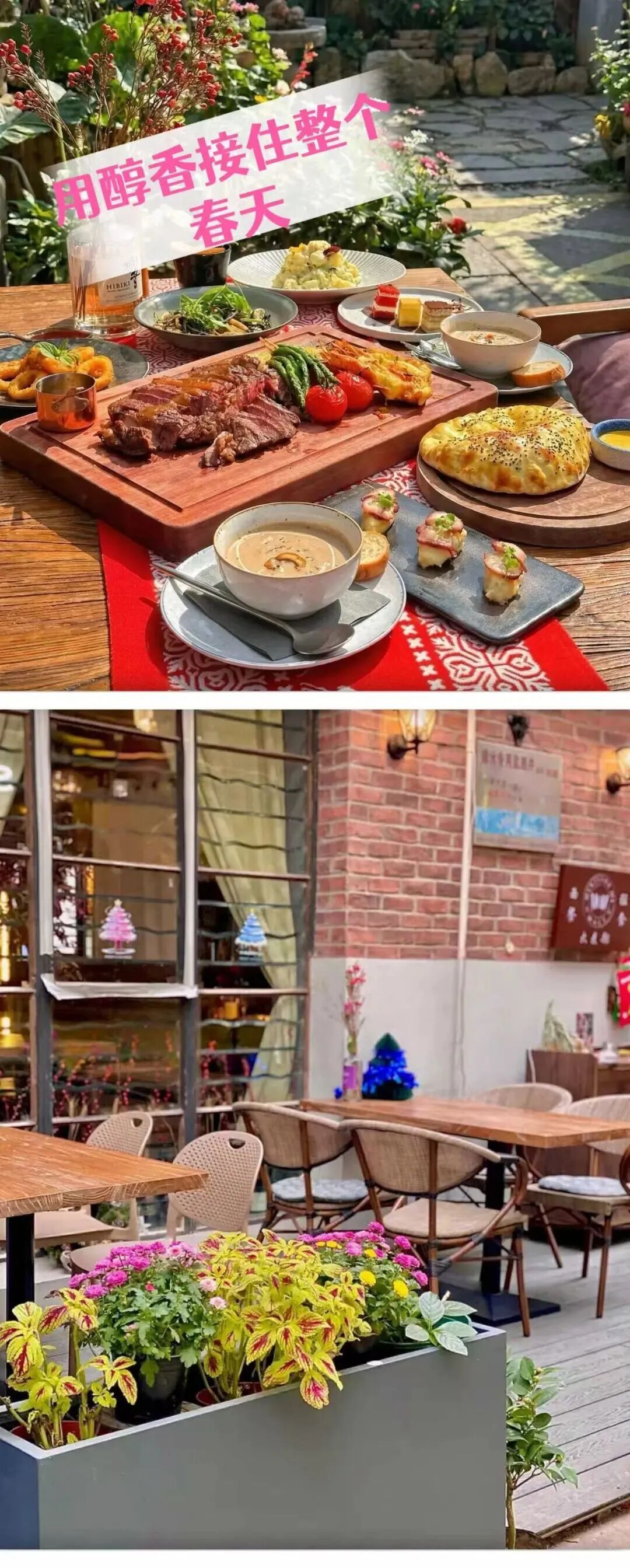 户外雅座兼具格调与舒适,威士忌醇厚搭配牛排鲜香,在暮色与春光里,品味微醺浪漫。