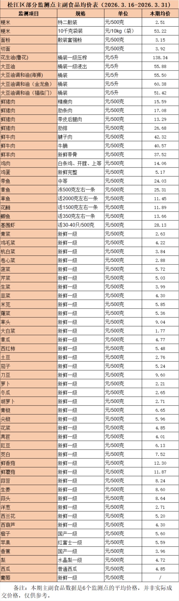 松江区部分监测点主副食品均价表(2026.3.16-2026.3.31)