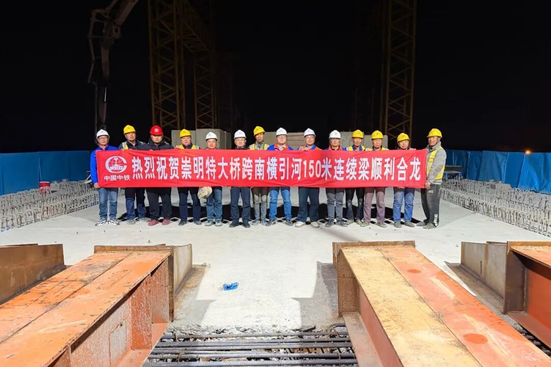 崇明特大桥全长19.07公里,是沪渝蓉高铁沪宁段V标控制性工程之一。本次合龙的跨南横引河(主跨150米)连续梁是标段内最后一座合龙的连续梁,也是跨度最大、施工难度最高的关键节点。该连续梁上跨崇明区Ⅵ级航道南横引河,紧邻市政道路,施工环境复杂,技术标准高。主梁采用单箱双室、变高度、直腹板箱形截面结构,中跨跨中及边支点梁高4.2米,中支点梁高9.0米,全桥混凝土浇筑总量约11800立方米,其中合龙段浇筑方量约41立方米,历时5小时一次性浇筑完成。