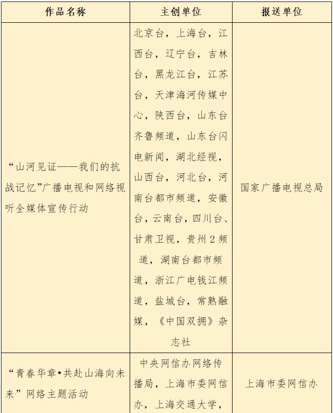 ▘“山河见证——我们的抗战记忆”广播电视和网络视听全媒体宣传行动(北京台,上海台,江西台,辽宁台,吉林台,黑龙江台,江苏台,天津海河传媒中心,陕西台,山东台齐鲁频道,山东台闪电新闻,湖北经视,山西台,河北台,河南台都市频道,安徽台,云南台,四川台、甘肃卫视,贵州2频道,湖南台都市频道,浙江广电钱江频道,盐城台,常熟融媒,《中国双拥》杂志社)