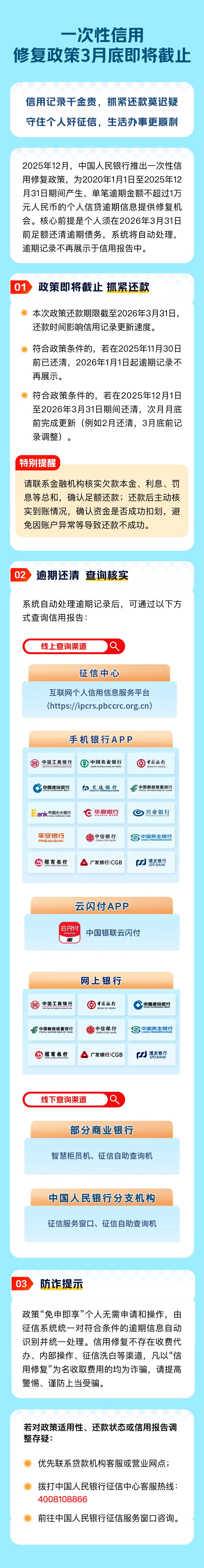 为支持信用受损但积极还款的个人高效便捷重塑信用,助力经济持续回升向好,中国人民银行近期发布通知——2020年到2025年期间,单笔不超1万元的个人逾期信息,个人在2026年3月31日前还清的,将不予展示逾期信息。