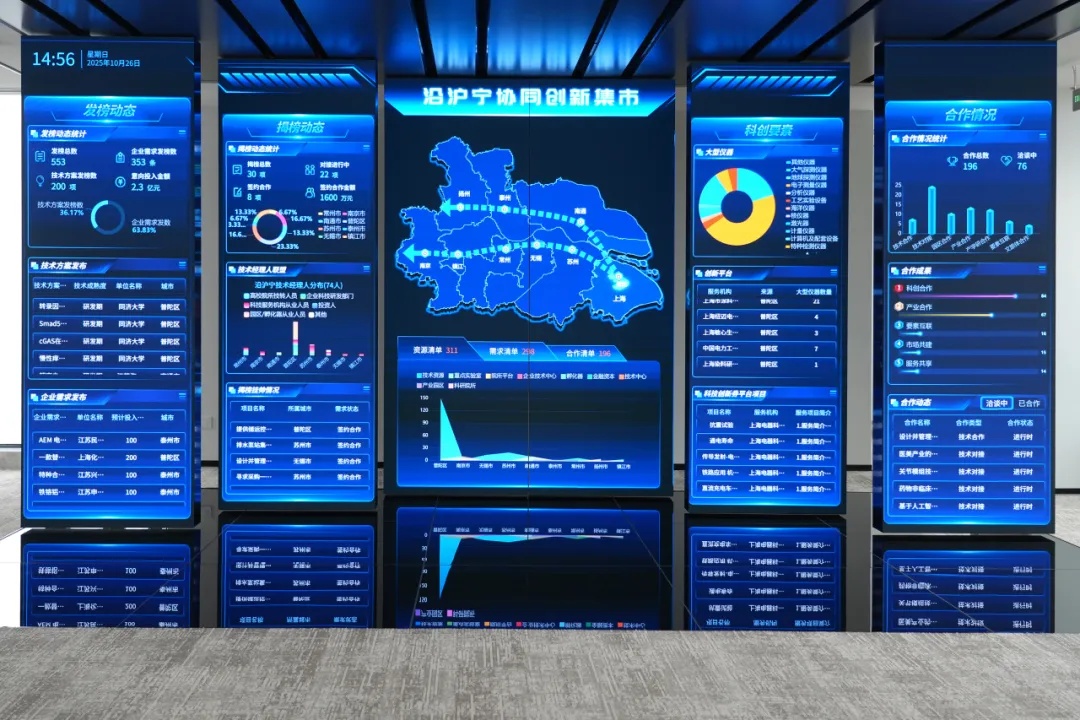传统区域协同,往往依赖“枢纽城市”。当年的曹安市场,作为全国蔬菜集散地,扮演“中心辐射”的角色。凭借市场覆盖全国30省市的蔬菜供求网,在台风天24小时实现调度1400吨蔬菜进沪,中心枢纽的效应显著。而今天,沿沪宁协同创新中心呈现的是一种全新的运行逻辑:它不再是单一的“枢纽”,更像一个去中心化的“网络节点”。印有南京、无锡、常州、苏州、南通、扬州、镇江、泰州等城市铭牌的工位一字排开,各地“特派员”像节点管理员一样平等互联、精准匹配。泰州不仅率先设立科创中心,同步推动园区跨区域签约,让“上海研发+沿线转化”的链条从构想走向实操。在这里,泰州干部可以直通华东师大实验室,南通企业能直接对接上海高校成果,苏州技术经理人也能链接上海化工研究院的国产替代订单——这种网状协同,打破了“中心-边缘”的辐射模式,构建起多中心、扁平化的协同创新生态。