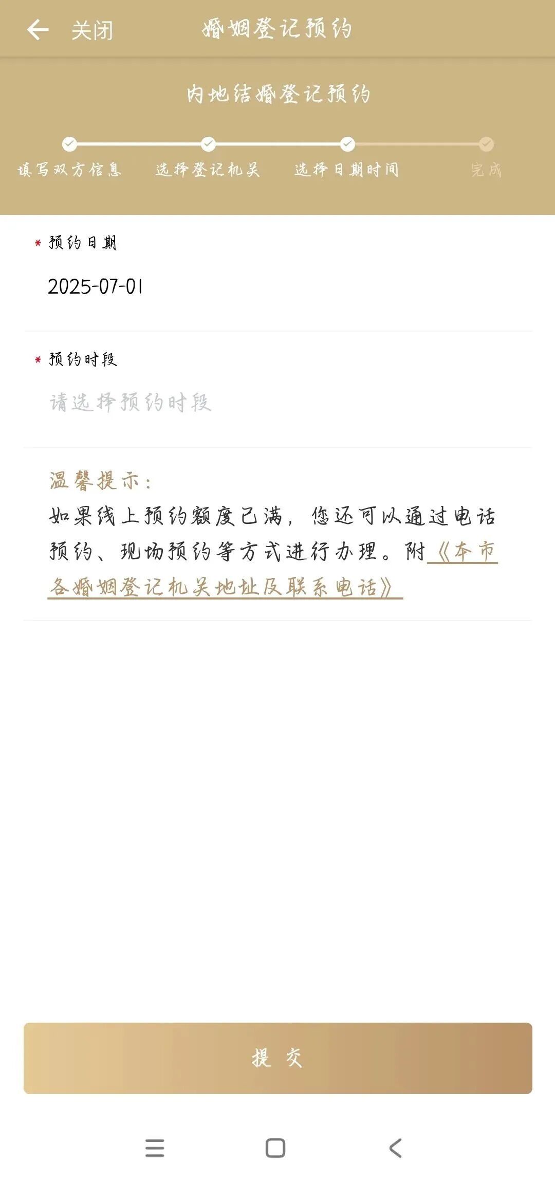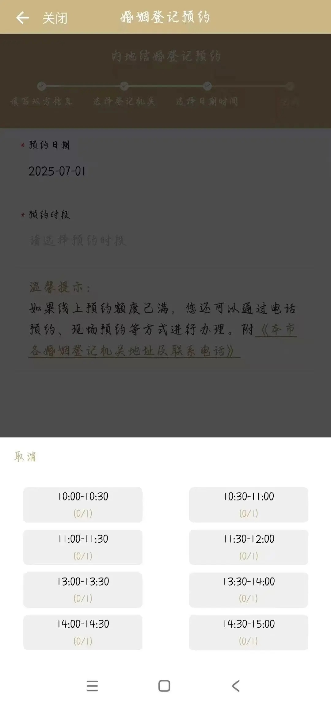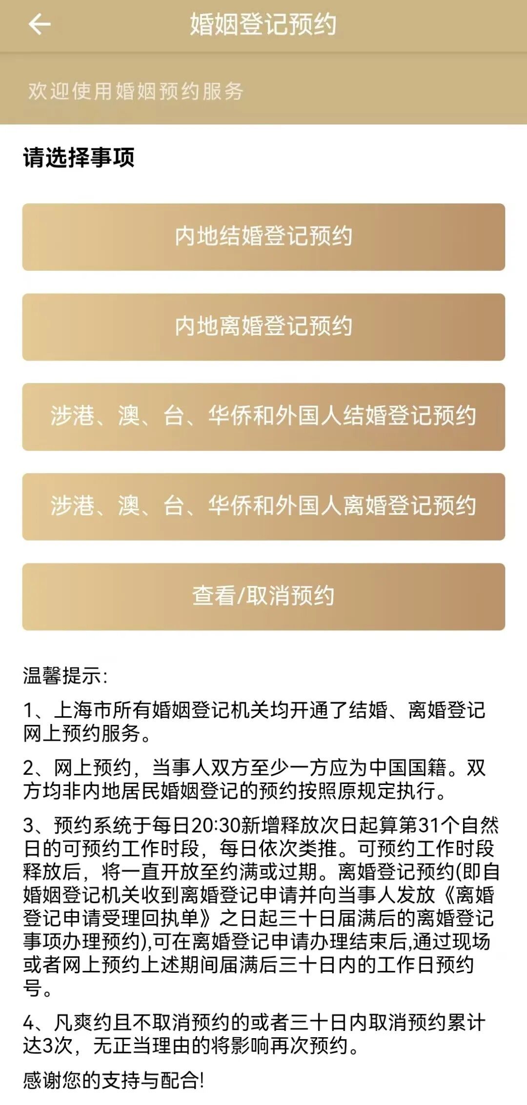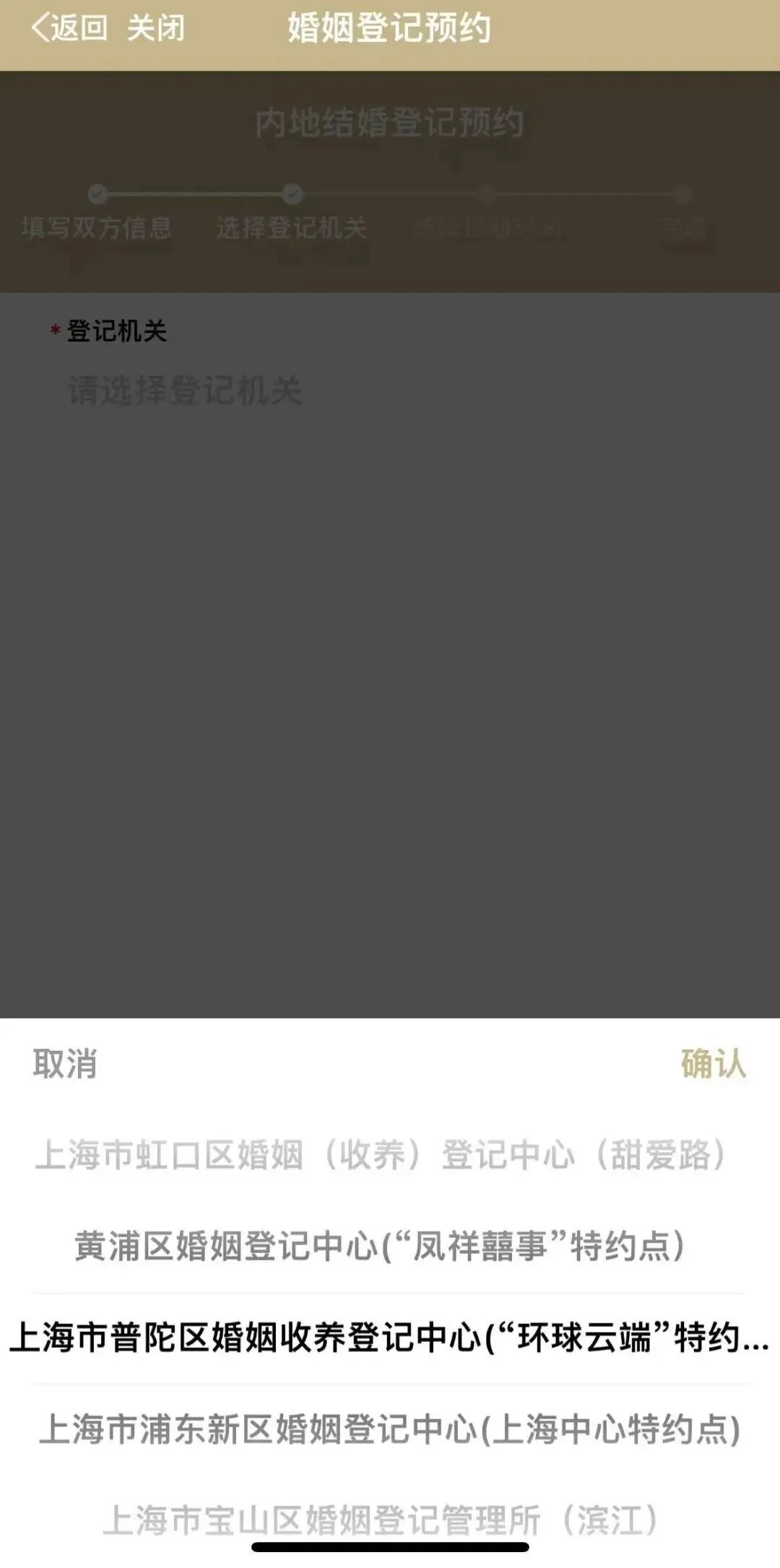 四月芳菲,云端焕新。于环球港之巅赴一场春日之约,看花影摇曳在云海之上,为彼此留下最耀眼的光影,4月22日、30日,与挚爱携手,将此番云端春色刻入心间。 惊喜四重奏 云端限定登记服务 云端浪漫颁证仪式 云端观景平台天际风景线 专属观礼名额 (一对新人可邀请5名亲友) 登记时间 4月22、30日 10:00-12:00 13:00-15:00 登记地点 环球港52楼 预约通道 在“随申办”App或随申办小程序搜索“婚姻登记预约”,选择“普陀区婚姻收养登记中心(“环球云端”特约点)”进行预约(4月1日上午9点开启预约,需至少提前1个工作日预约,当天限约15对),操作如下: ▲选择 结婚登记预约 ▲选择 普陀区婚姻收养登记中心 (“环球云端”特约点) ▲选择 预约日期和时段 ▲选择 空余时段即可 << 滑动查看下一张图片 >> 请至环球港B座1楼出示预约成功短信,之后乘坐电梯至52楼进行登记。 咨询热线及时间 咨询热线 62455667 周一至周六 9:00-11:30 13:30-16:30 交通 轨交3、4、13号线 (金沙江路站) 温馨提示 •请携带双方身份证及相关证件材料,确保手续齐全 •自带3张2寸双方近期彩色半身同版正面免冠合影证件照片 •建议准备合适的服装与道具,留下专属合影 •活动当日人流较大,请合理安排出行时间 资料:普陀区民政局 编辑:王雨思 点击下方了解更多 【苏河回响】区域协同,要“联网”更要“重构” 【预告】就在明天!“家门口的好学校”上新,这次将探访的学校是…… 普陀 你好 | 花田逐乐,春野藏欢 科技赋能,健康育人!宜川附校打造智慧操场,变成“运动乐园” 【健康】孩子度数不高,要不要戴眼镜?护眼课堂开讲啦→