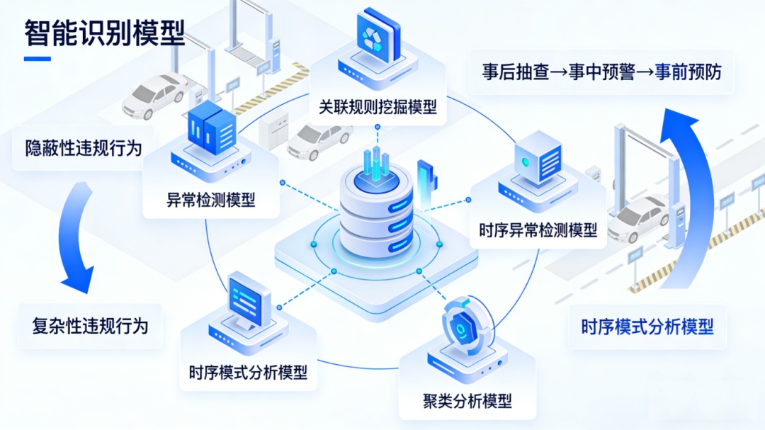 构建集成了异常检测模型、关联规则挖掘模型、时序异常检测模型、时序模式分析模型、聚类分析模型等多种机器学习与深度学习算法的智能识别模型群,智能识别出机动车排放检验中出现的各类隐蔽性、复杂性违规行为,推动监督管理从“大海捞针”向“精准识别”转型,以技术赋能“触发式”监管。